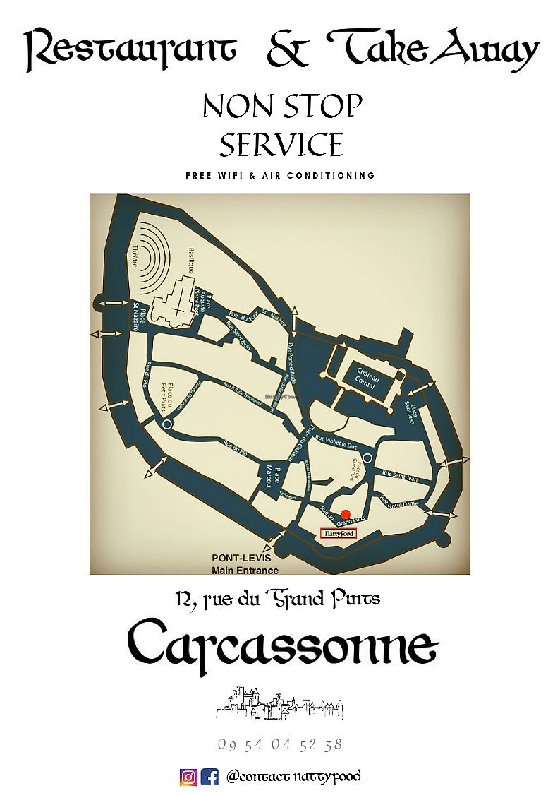Very clear, separate menu’s, for fully vegan, and gluten free. Friendly and helpful staff that also speak very good English. Not expensive. Good quality food, and good company including the house pets. When you are in Carcassonne, look no further and eat here. I am a big guy and like to eat a lot. I had the raw salad and the flammkuchen (see other reviews for pictures) and it filled me up very good. Tip, try the home made lemonade.