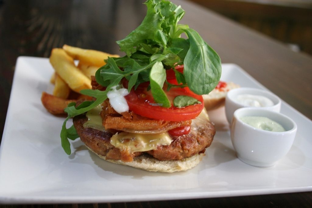 Hamburguesa de seitán y soja a la barbacoa con queso vegano y patatas …