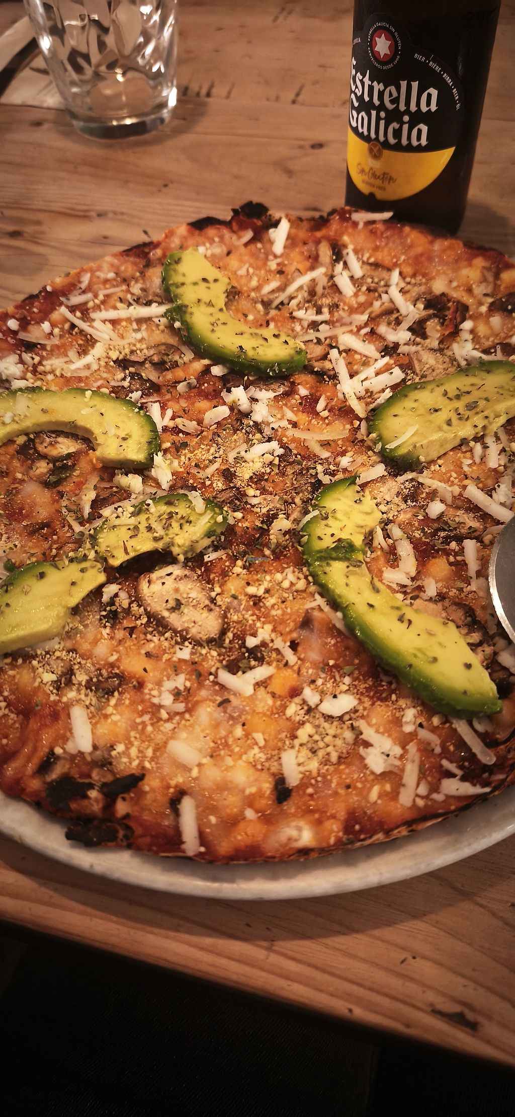 La masa de la pizza es finita y más blanda que una con gluten, pero está rica. Pedí la pizza con varios tipos de queso vegano (incluido queso azul) y aguacate.