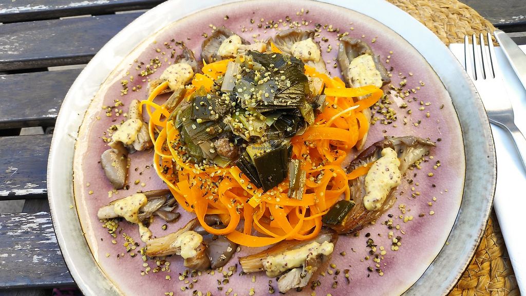 Pleurotes à la moutarde, poireaux et tagliatelle de potimarron