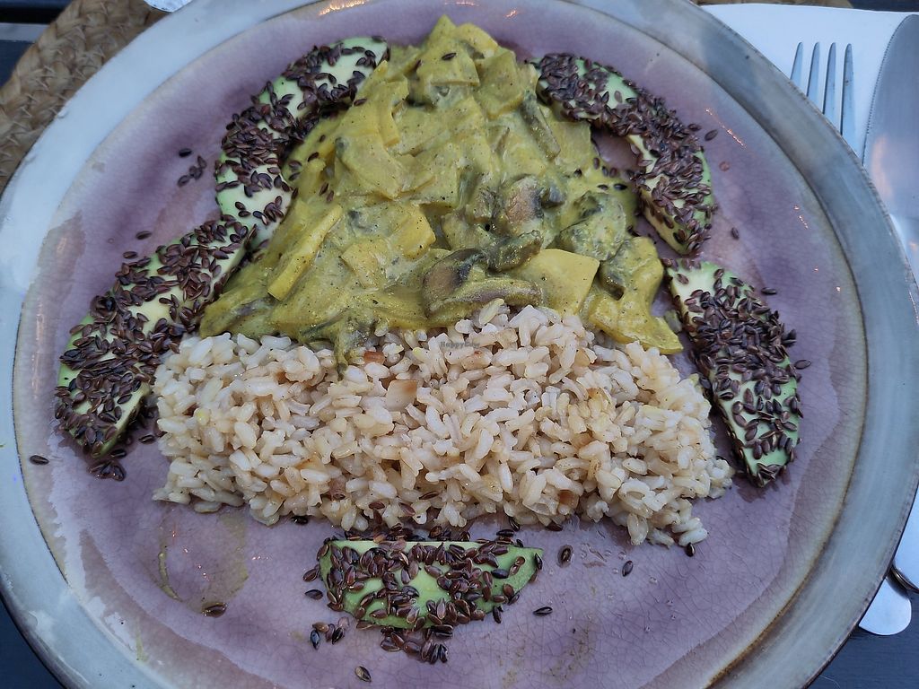 Curryreis mit Pilzen und Avocado in Leinsamenmantel