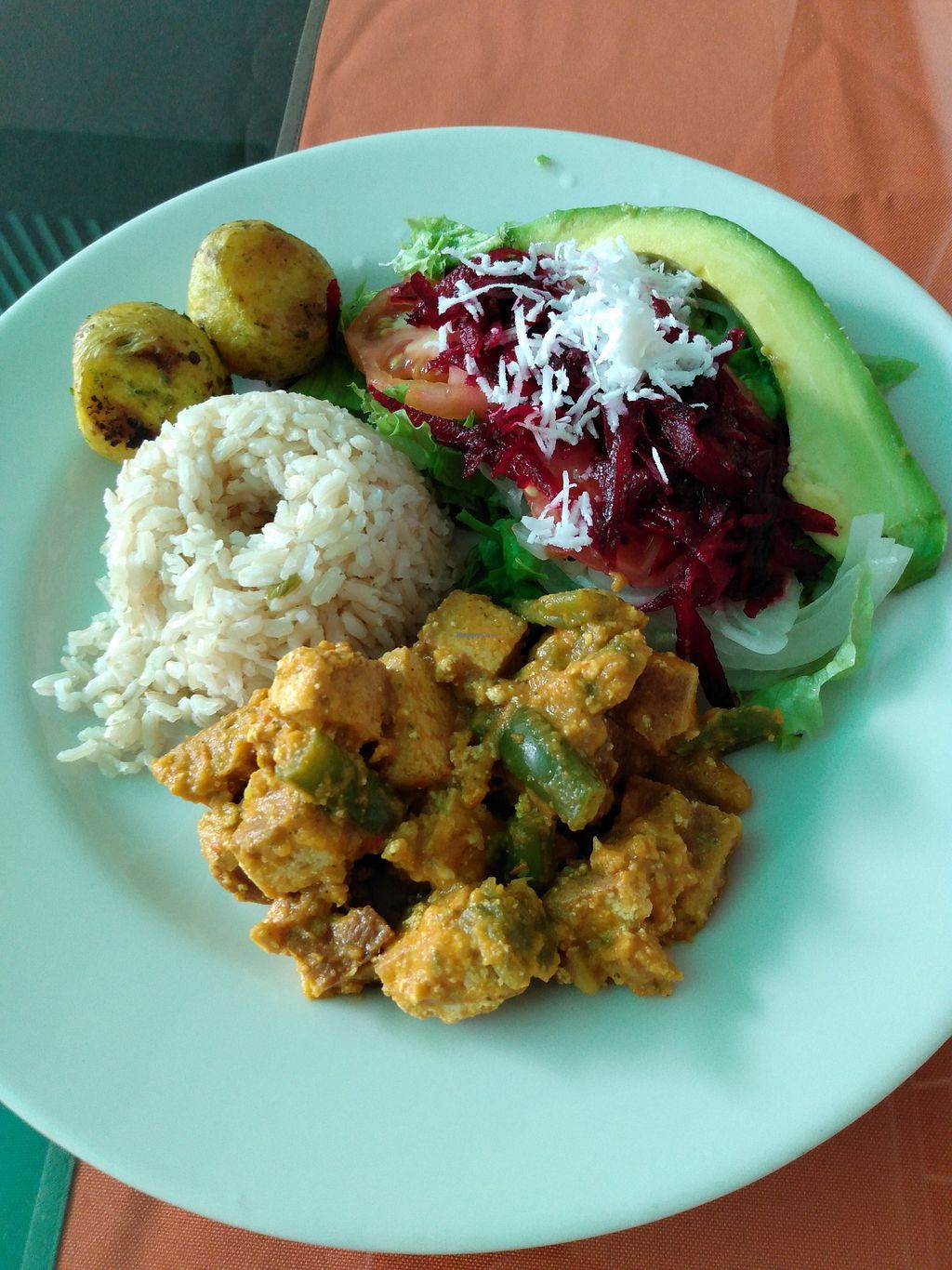 Tofu with green beans, salad, rice, potatoes