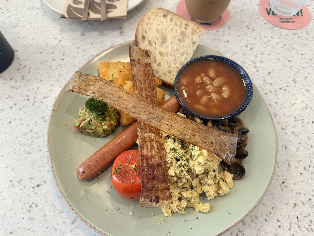 I had the vegan English breakfast, and then the next day I had the fish n chips, plus hot chocolate on both days.