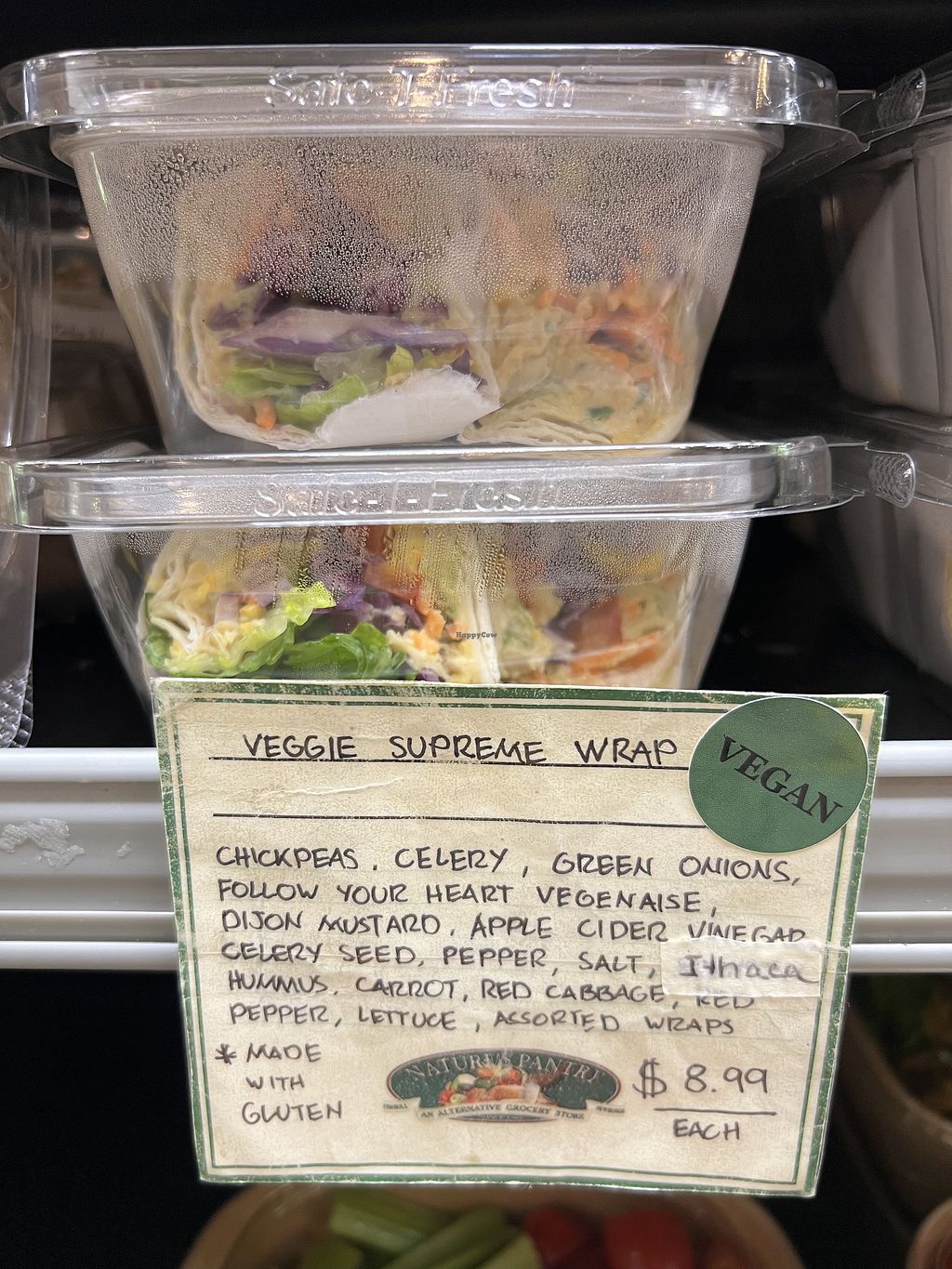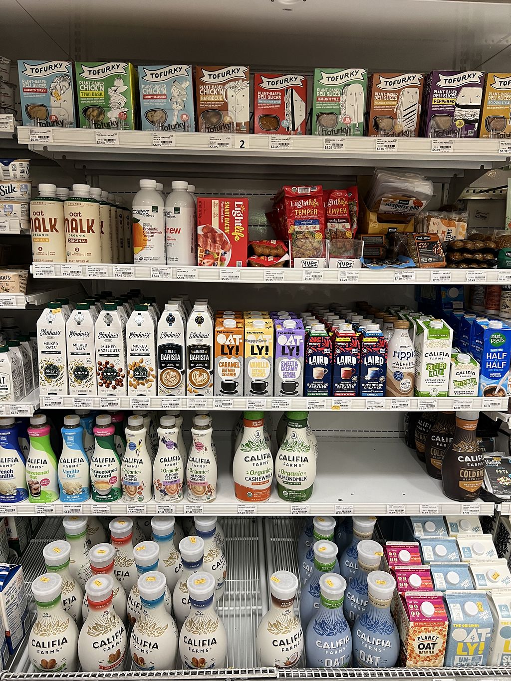 The deli itself has a few vegan options including desserts, juices, and smoothies. The refrigerated section has a good variety of vegan offerings. Familiar grocery store staples include 4 sections of refrigerated vegan offerings!