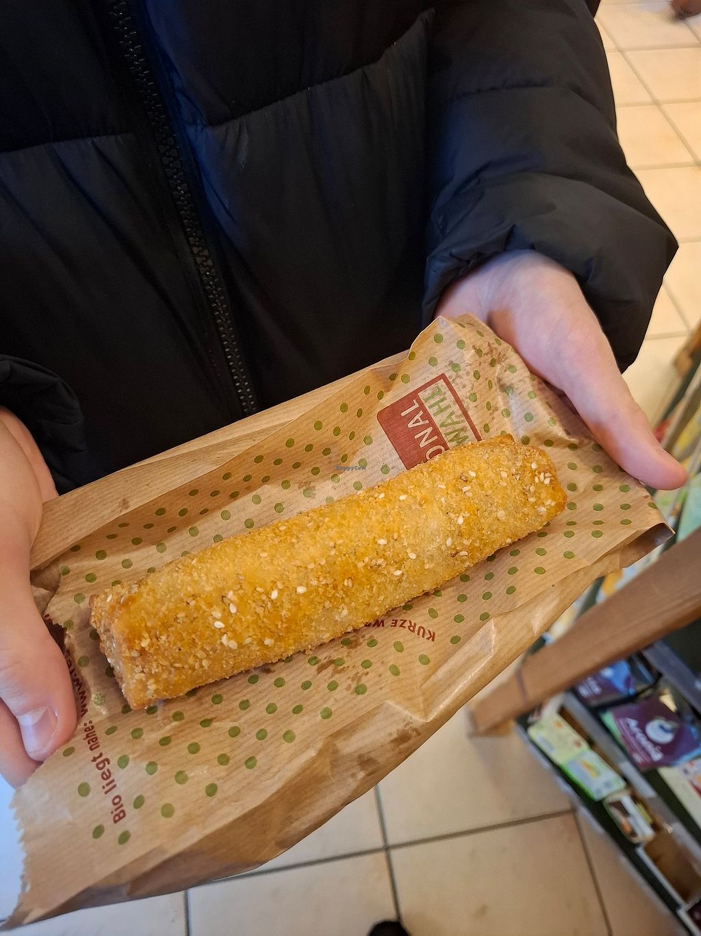 Ich hatte eine Stange mit Tofu gefüllt. Sie war lecker und hat 2,79€ gekostet. Es gab noch ein süßes veganes Gebäck. Mochte den Laden, aber es gab kein krasses veganes Angebot.
