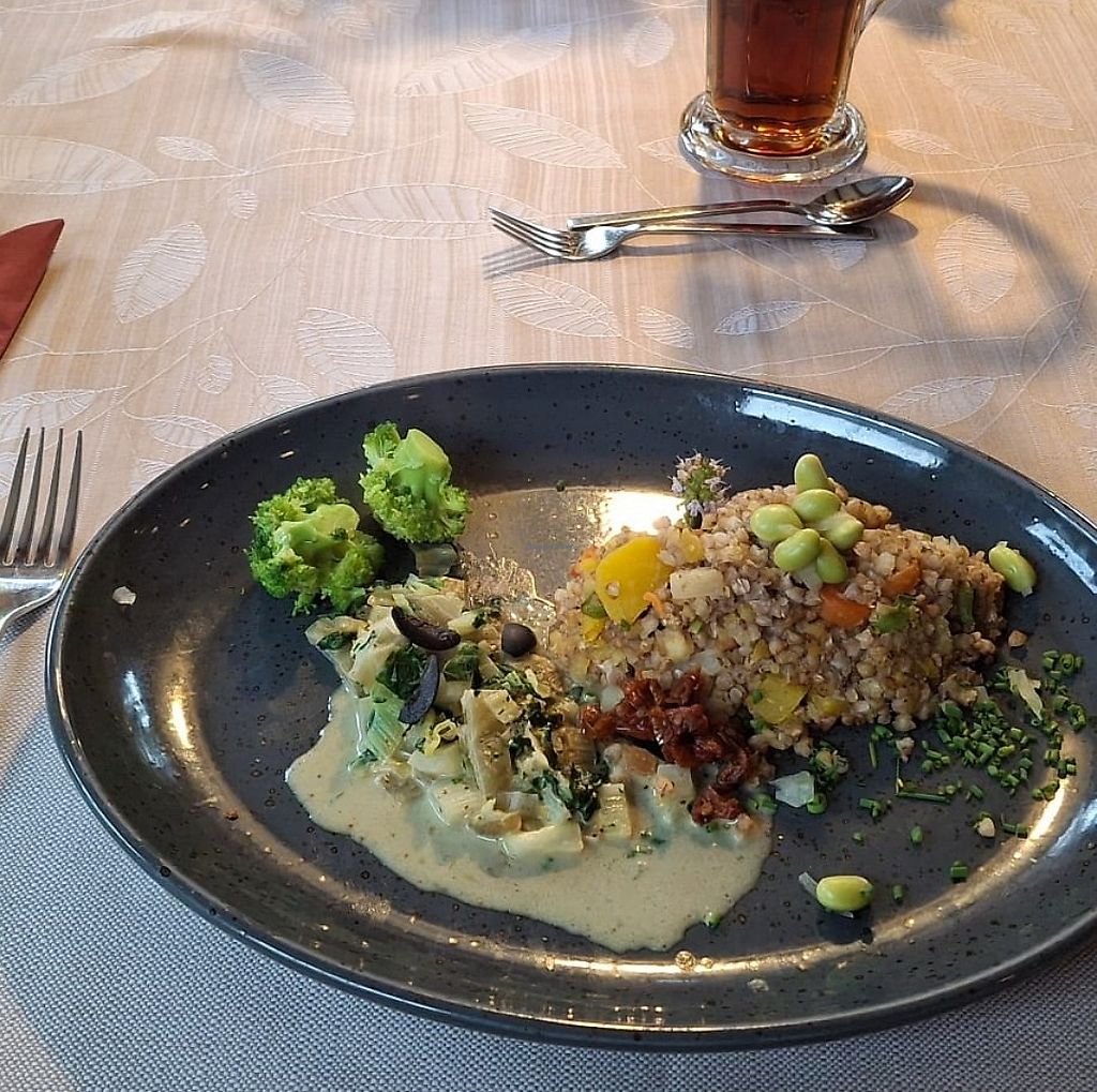 veggiebowl with onions and herbs and pesto