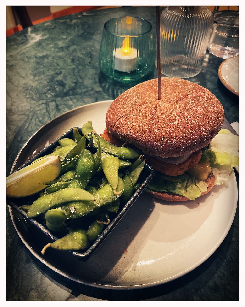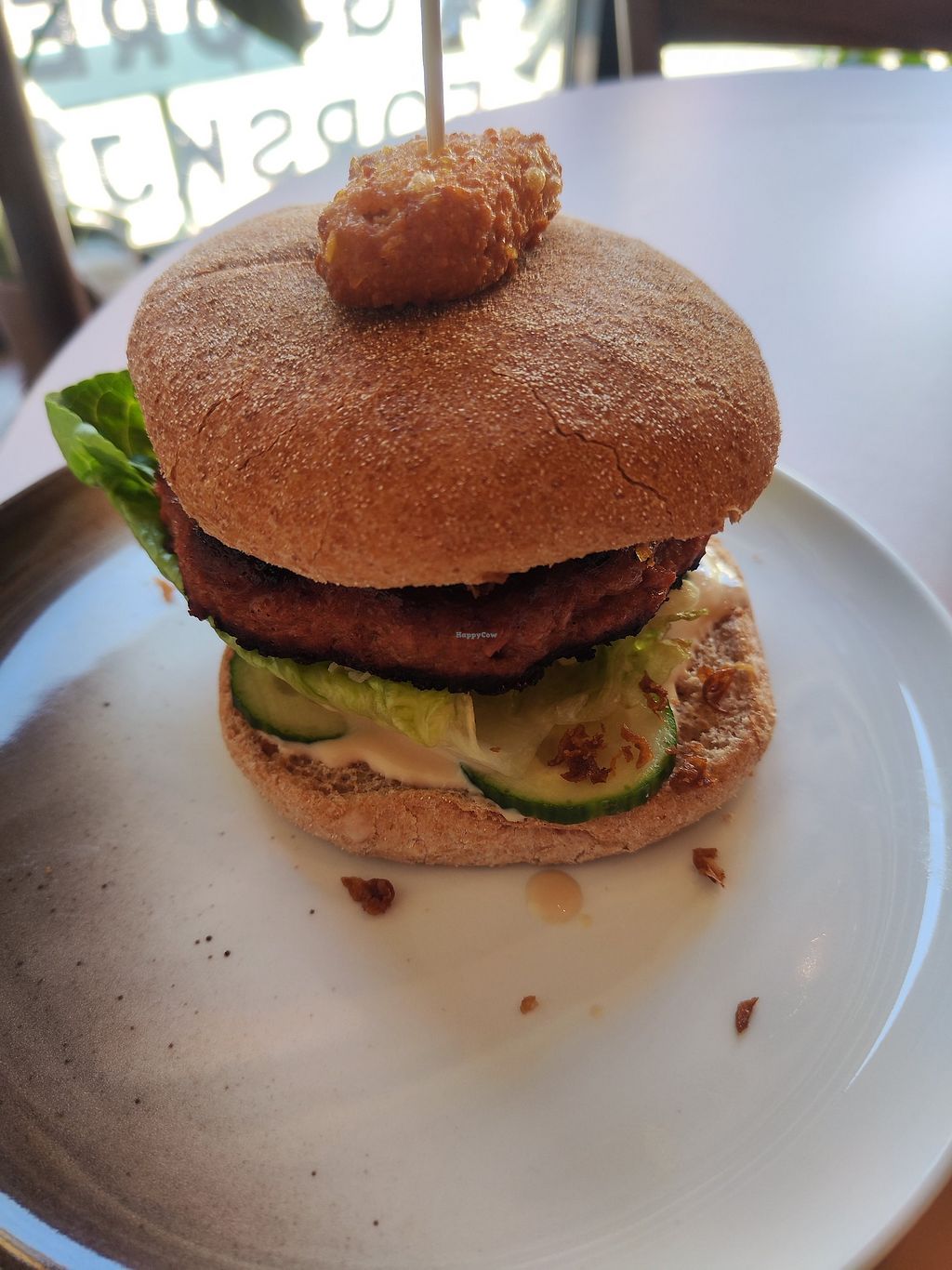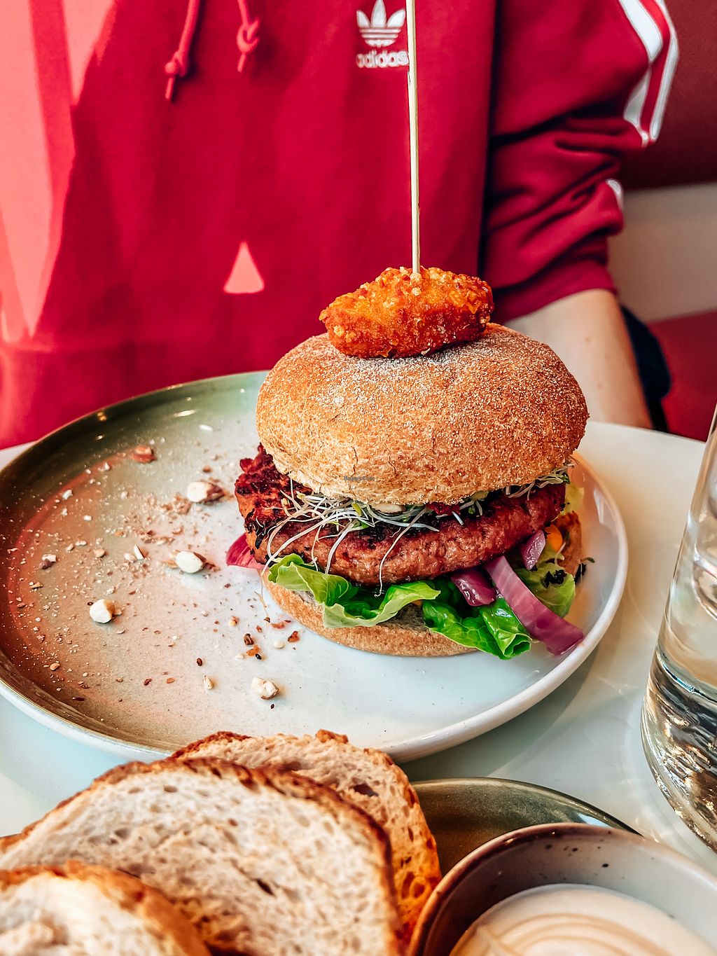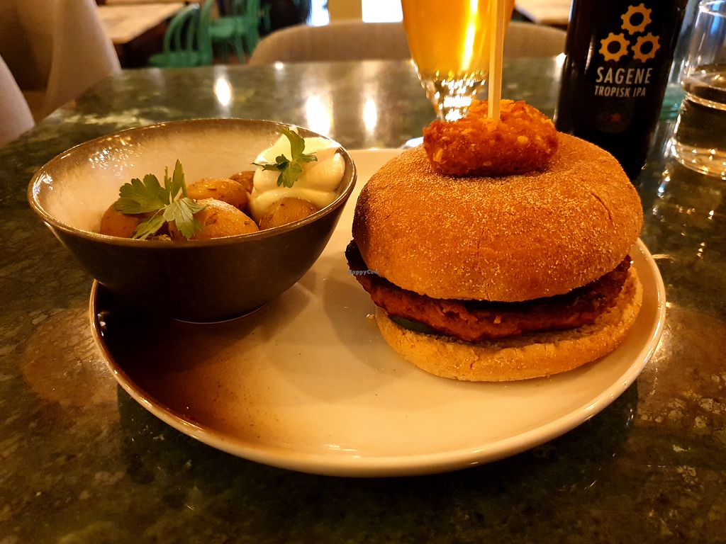 Classic burger med vegansk «parmesan», syltet agurk og diverse grønnsa…