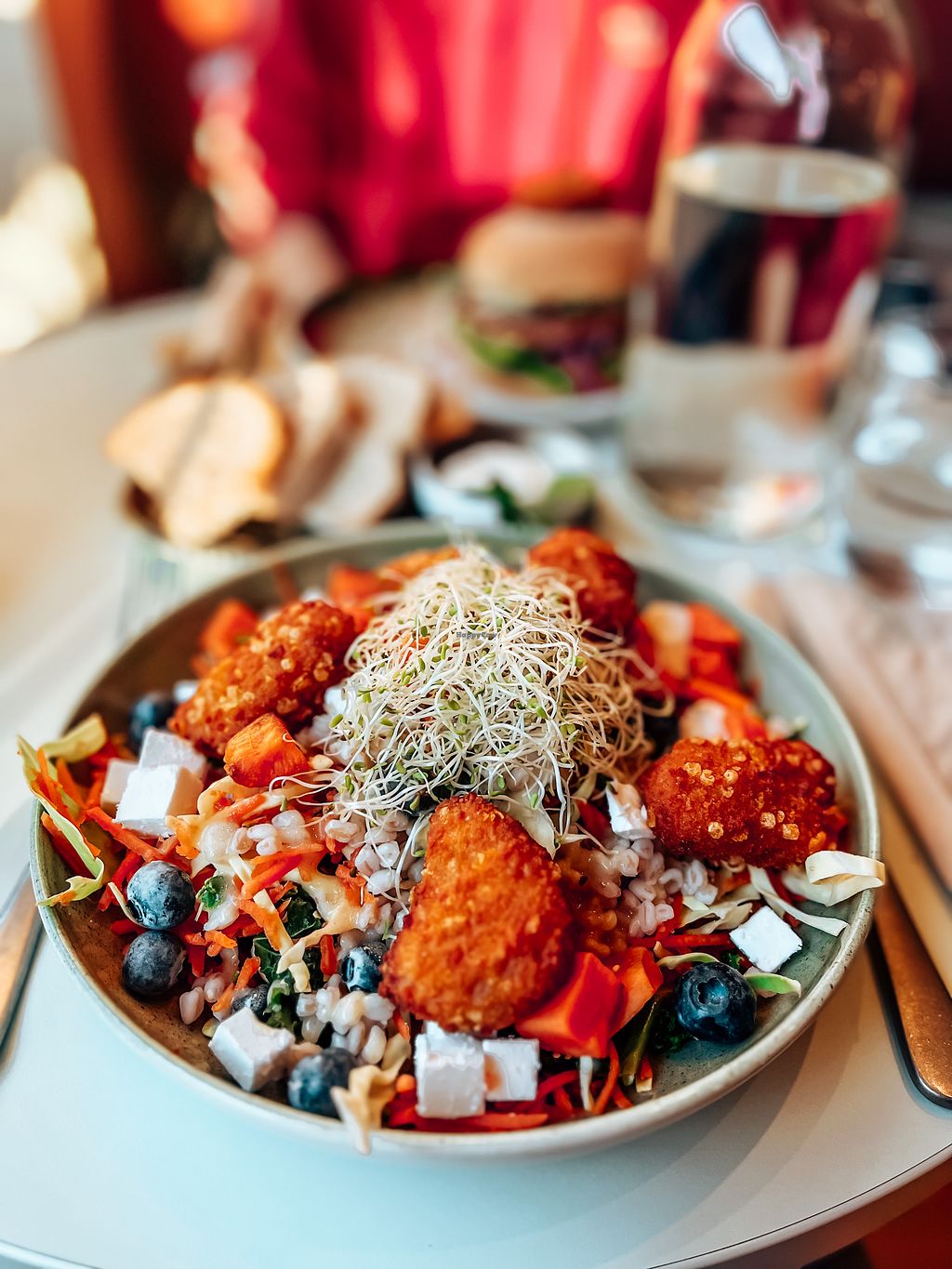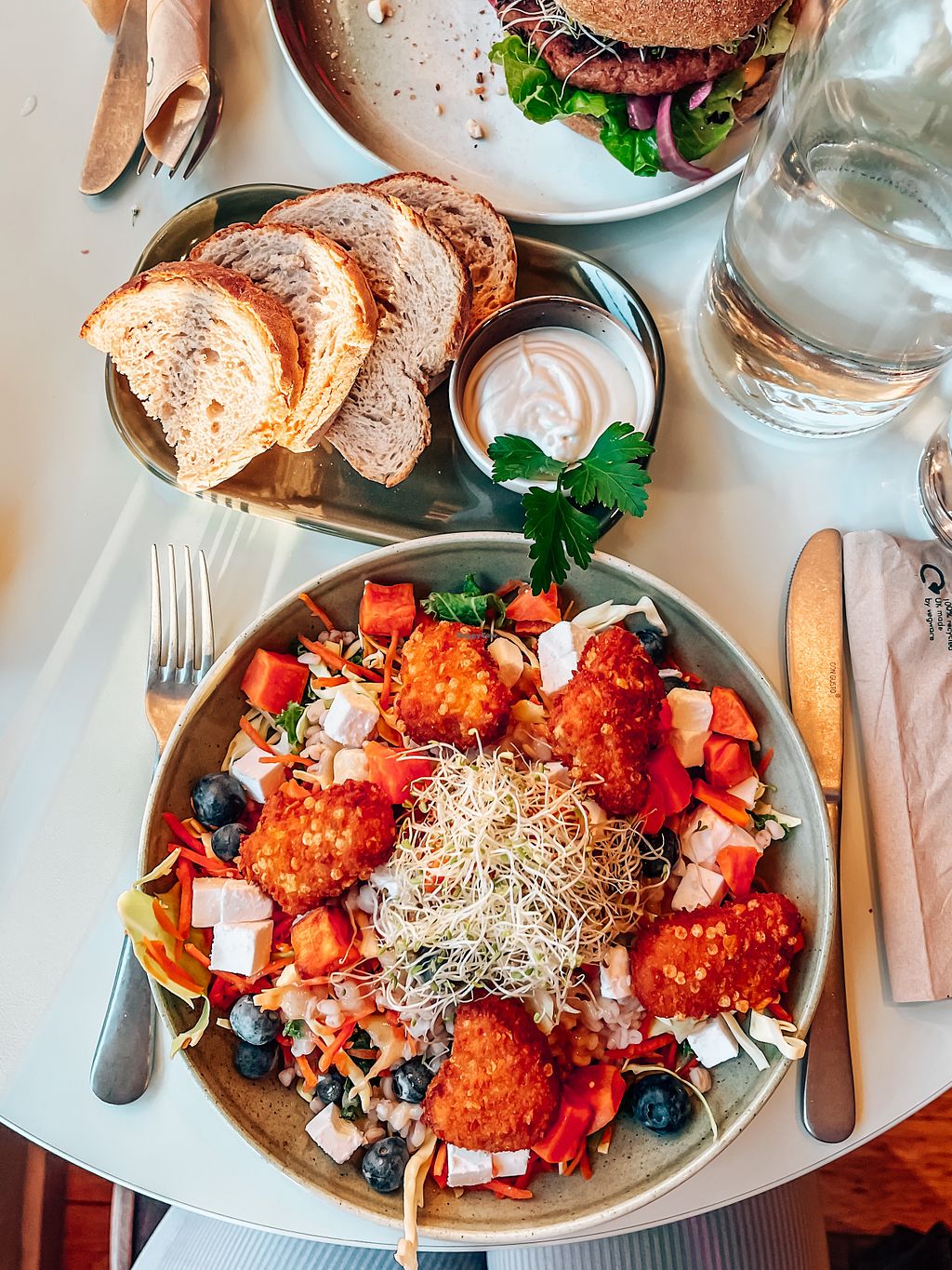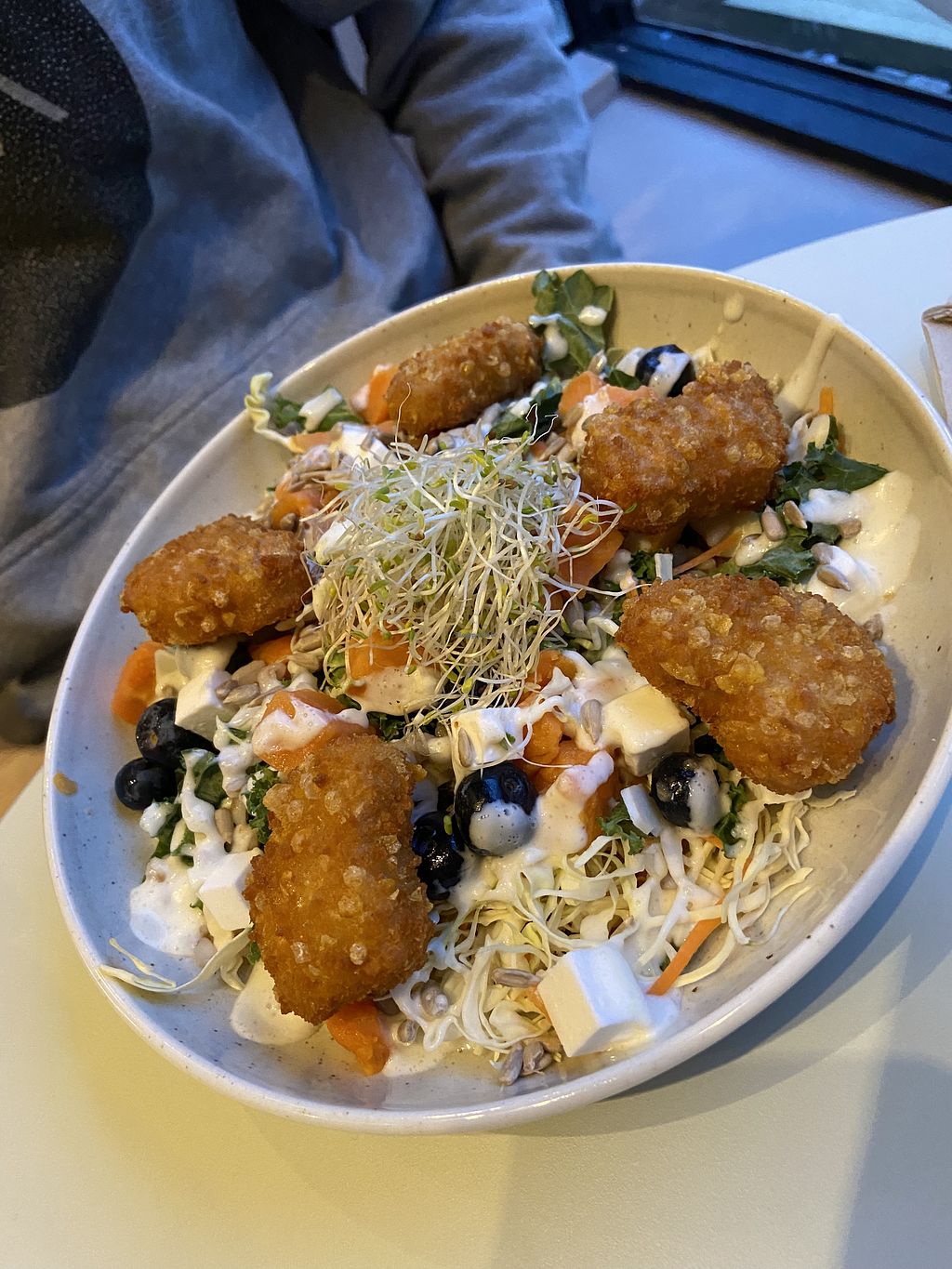 Salad with blueberries, topped with Naturli’s nuggets and garlic dress…