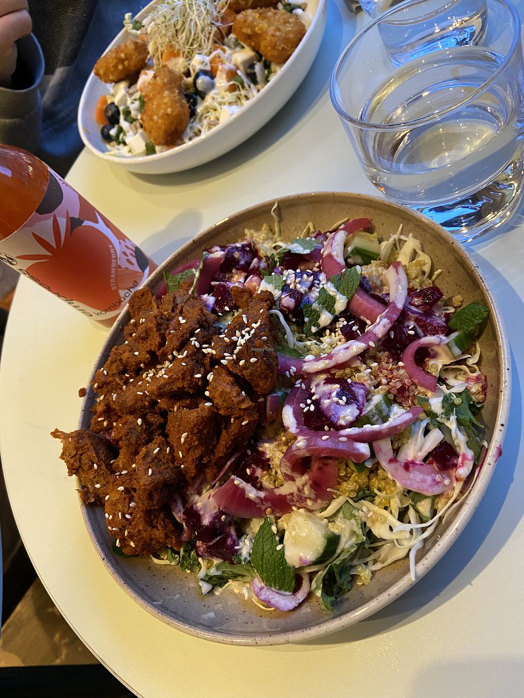 Salad with quinoa and soy bites, topped with tahini and lime dressing.…