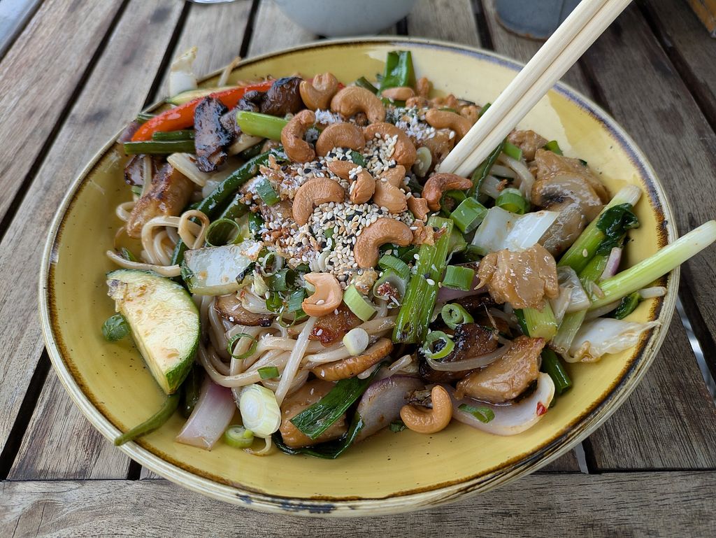 Wij hadden een lekkere Vegan wok met vegan kipstukken en noodles. Zeer vriendelijk personeel en een lekker muziekje op de achtergrond.