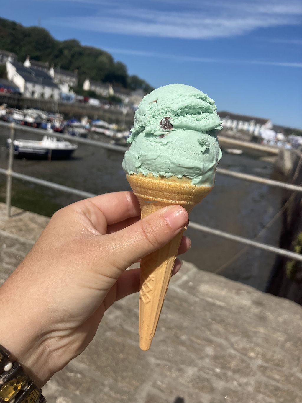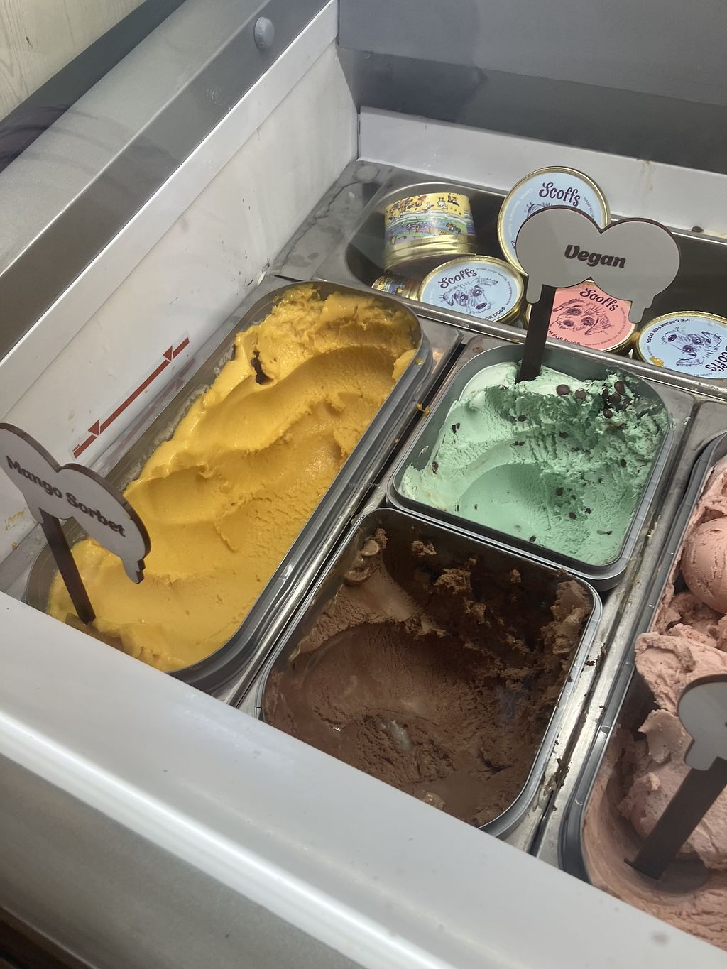 Raspberry and vanilla vegan ice cream on top, chocolate vegan ice crea…