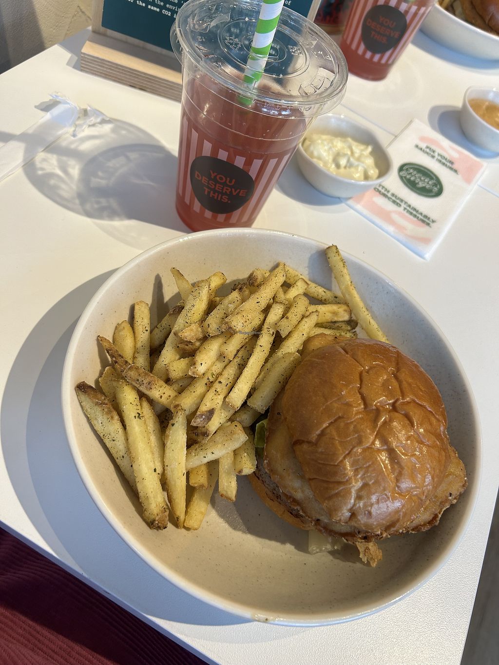 Grilled chick’s & basil pesto, seasoned fries and slaw