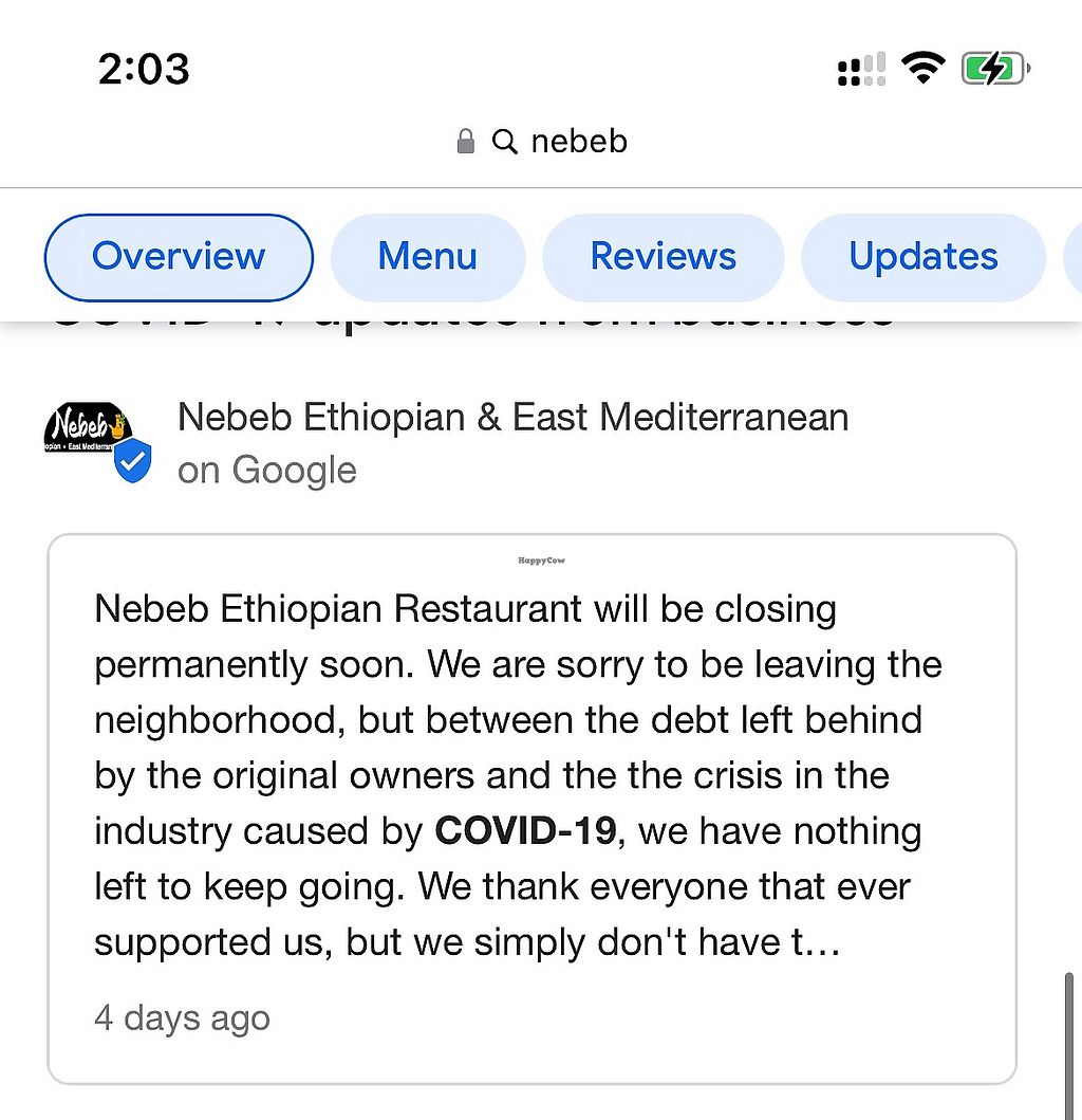 Nebeb (named after the new owner’s grandmother) is the new iteration of Ras Dashen (same location). The daughter of the former owner now runs the restaurant. Same recipes. Same nice people. The big improvement is that vegan options in the Entrees section are now clearly labeled! Yay! Makes ordering easier. Each entree comes with two sides. Only one is clearly labeled vegan, but most others can be made vegan / no butter. Yum! This is my favorite non-vegan restaurant in the city.