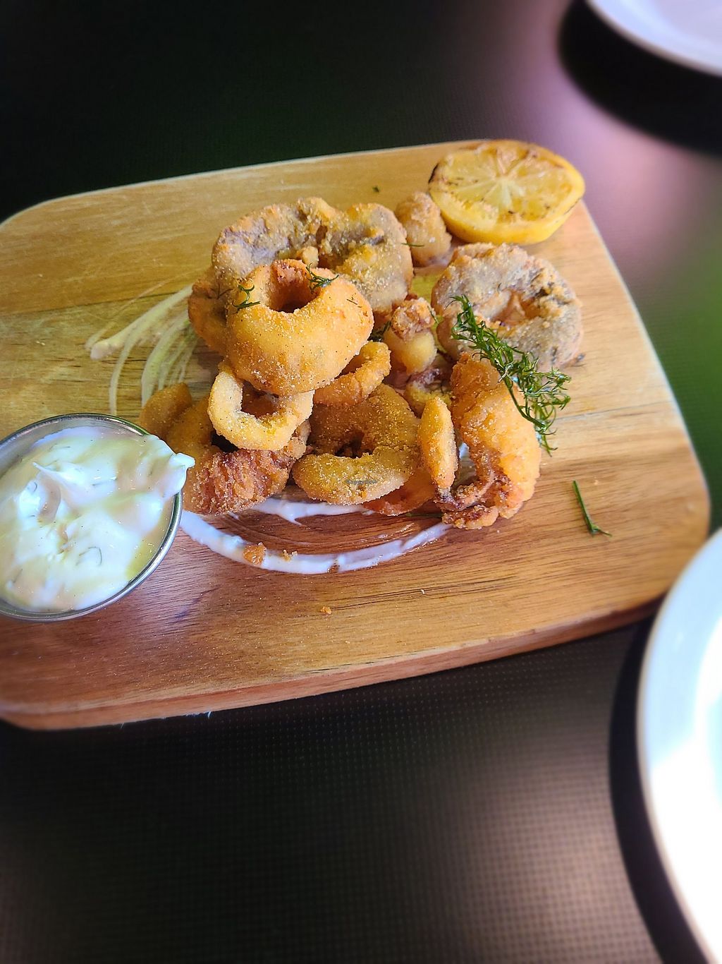 Vegan shrimp (konjac) and garlic knots bread rolls.
