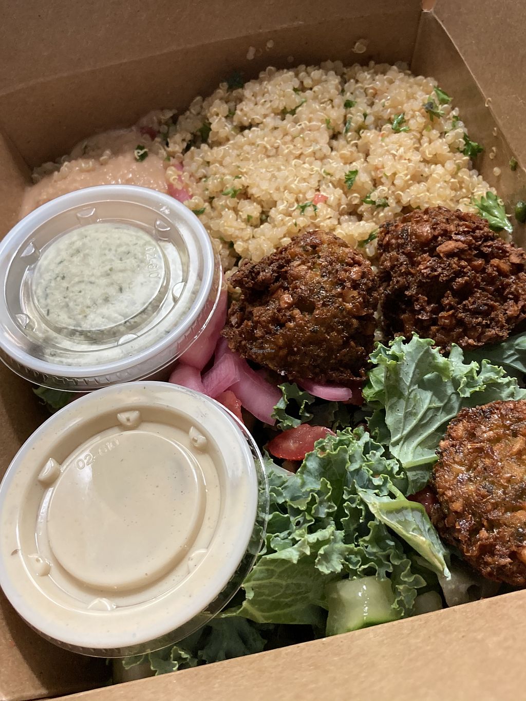 BBQ Jackfruit Pizza, Falafel Salad, & Konjac Shrimp