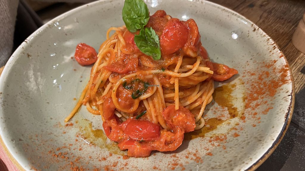 When we got there the waiter had no idea what could be made specially vegan other than the two existing options (a starter of mixed veggies and a antipasti of bean soup). I asked about the pistachio pasta without prawns that others on here have had and he said the sauces were pre-made and couldn’t be changed. We received fusilli with cooked veg which was alright but not super filling. Also the house red wine is sour.