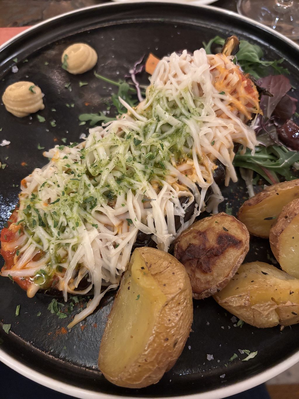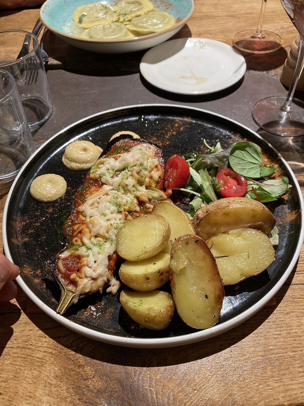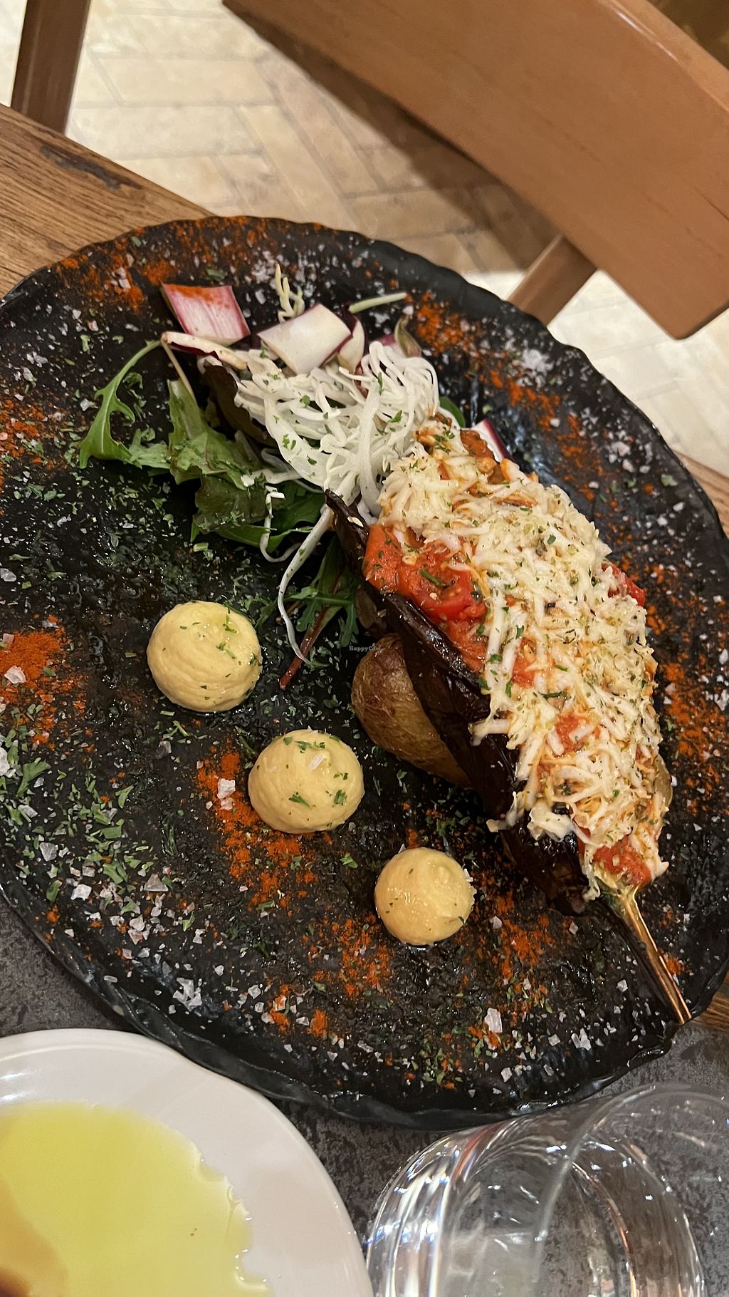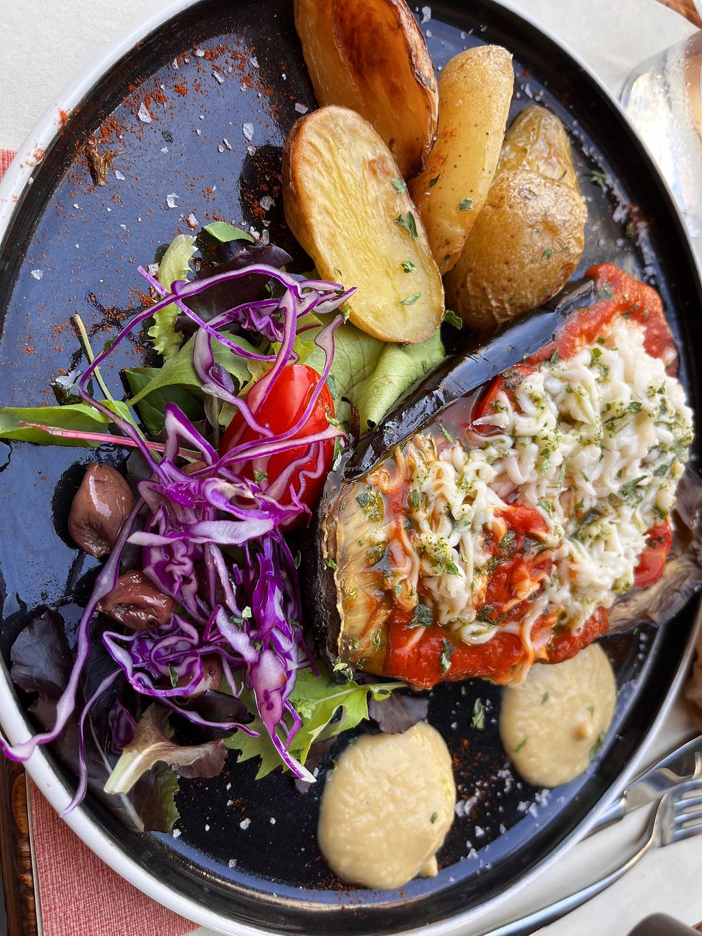 Read morei had aubergine stuffed with tomatoes and topped with rice mozzarella, potatoes and chickpeacream on the side.