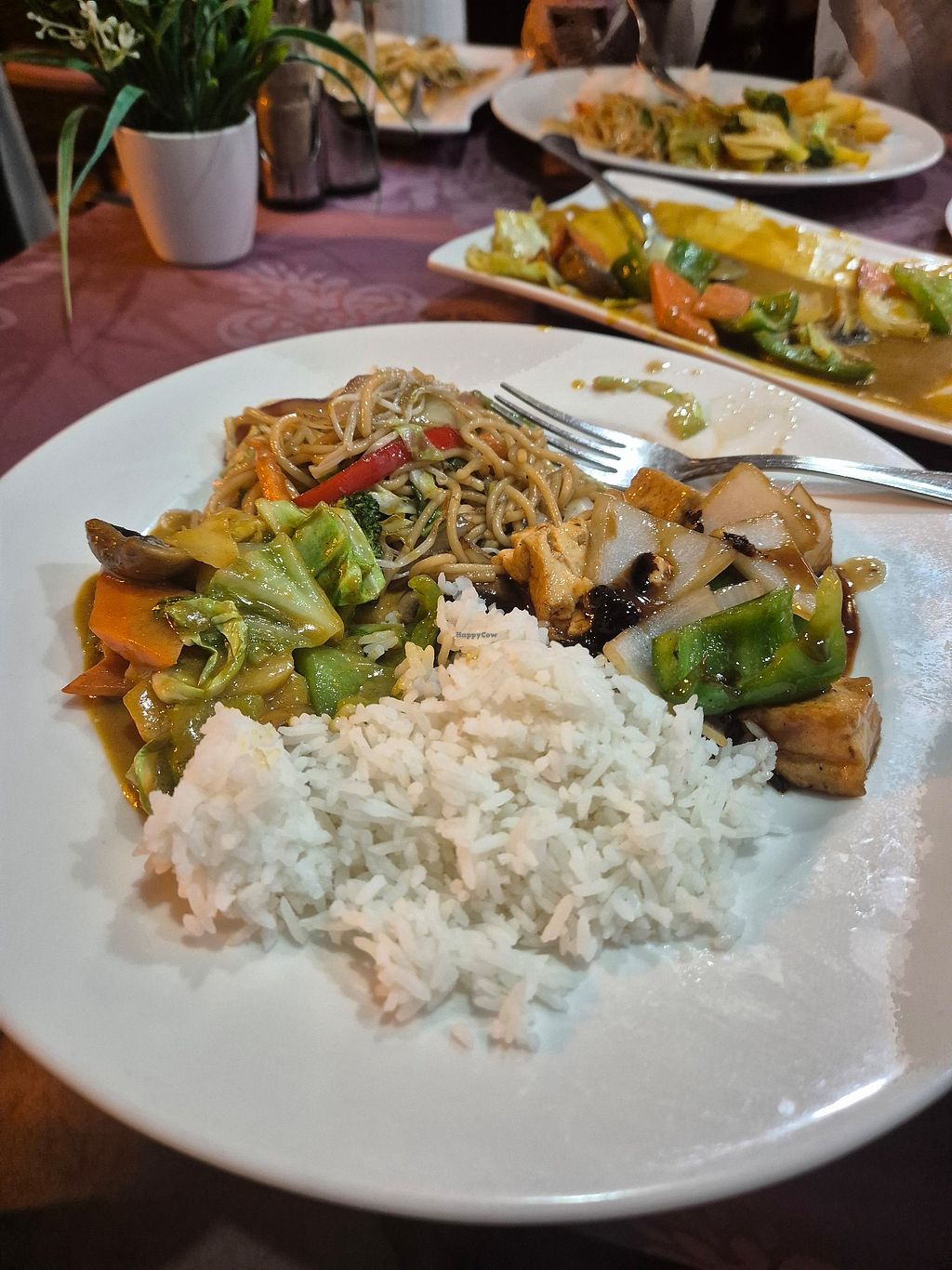 Rice, noodles with veg, curry veg and tofu in black bean sauce