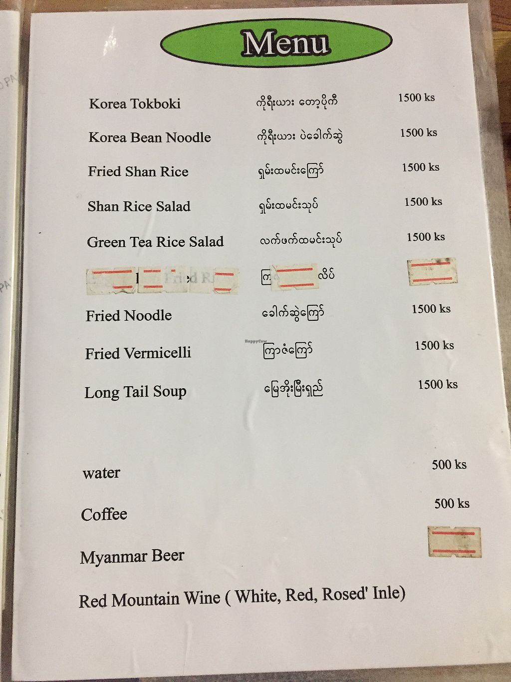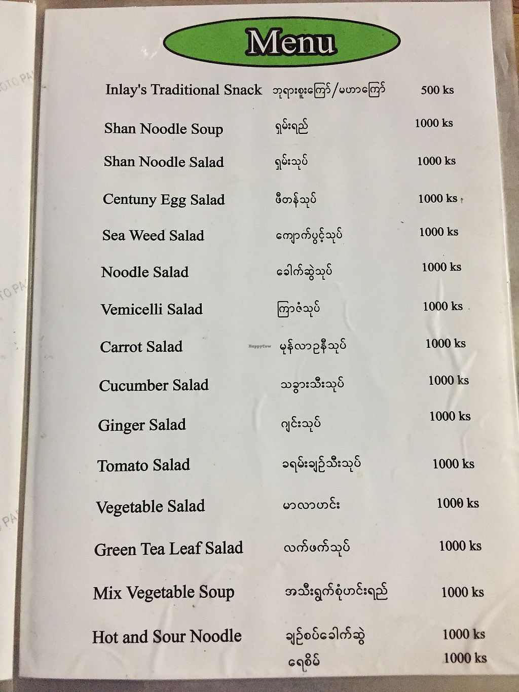 Menu - everything except drinks 1000 kyat