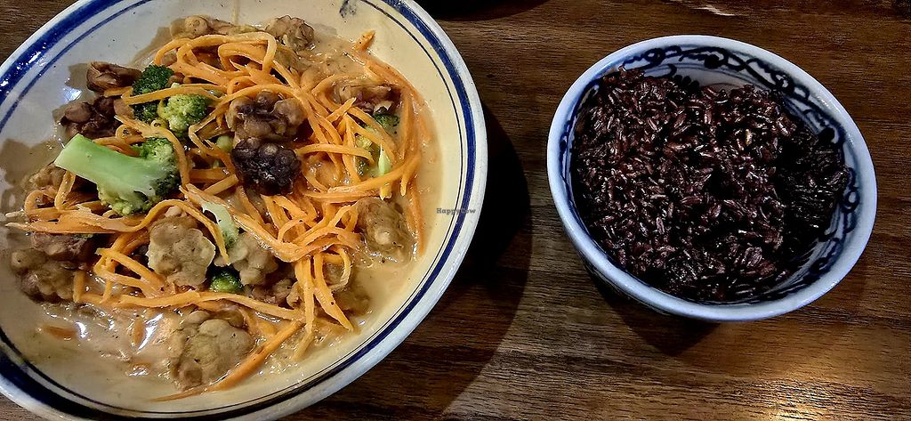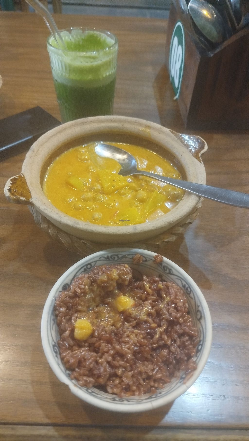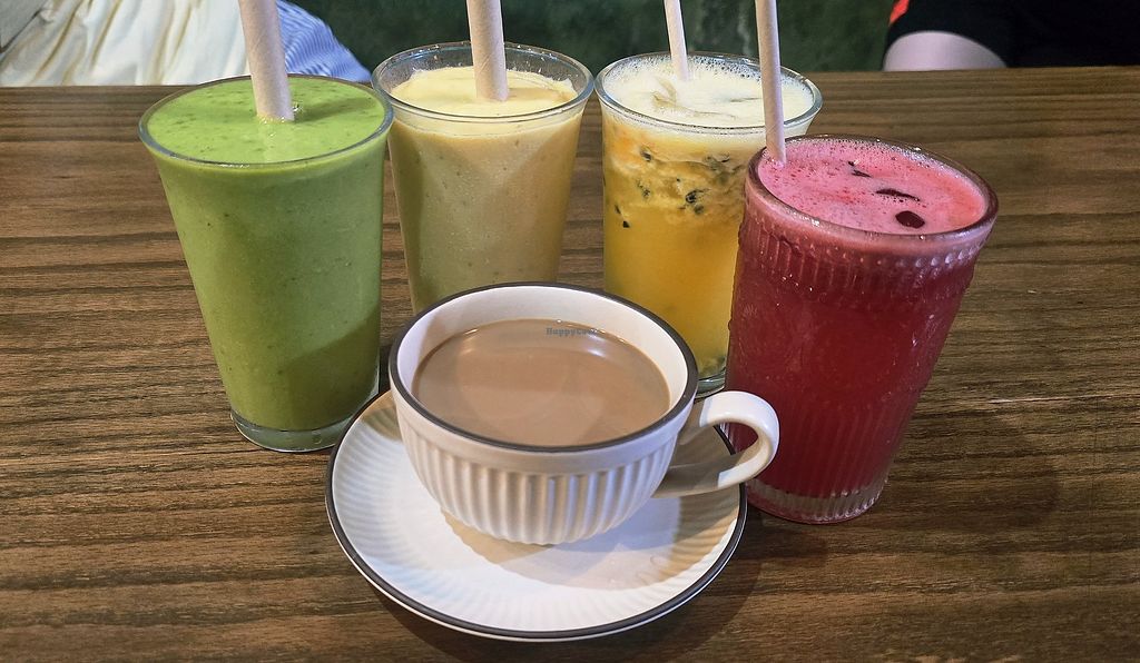 100% vegan, every dishes was delicious. Chickpea curry, tofu ginger and coconut, fresh spring rolls, morning glory, green juice, mango and banana smoothie, delicious coffee and cake. Wow 👌 such friendly people. A little haven.