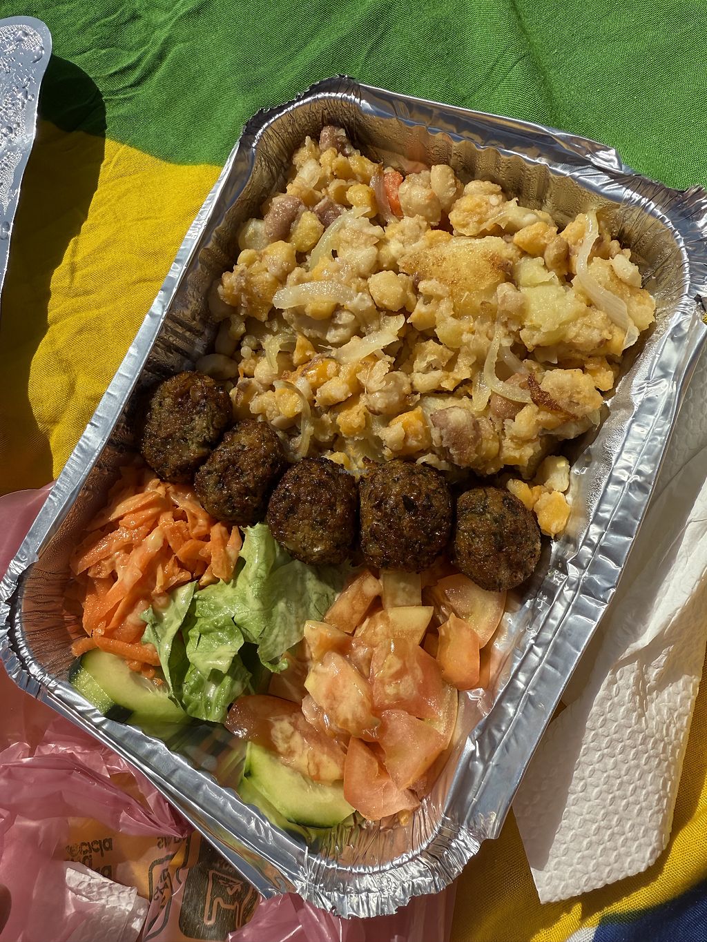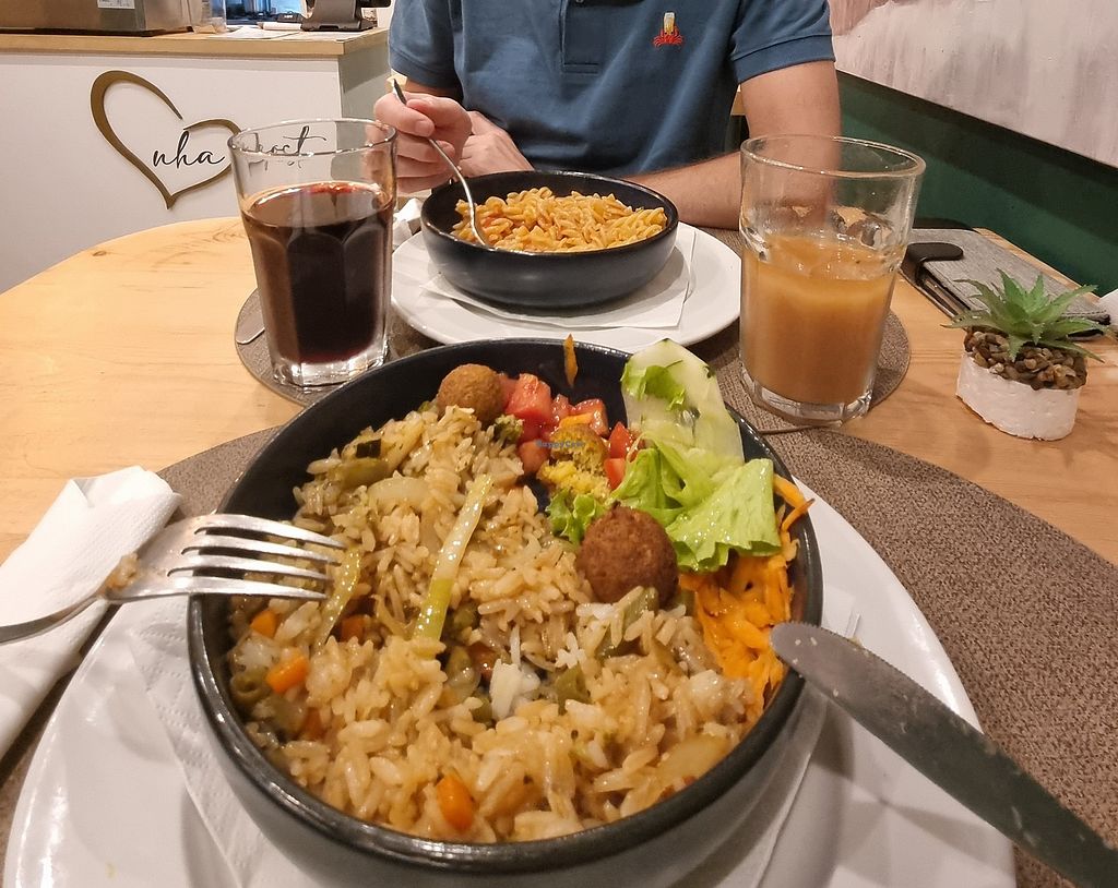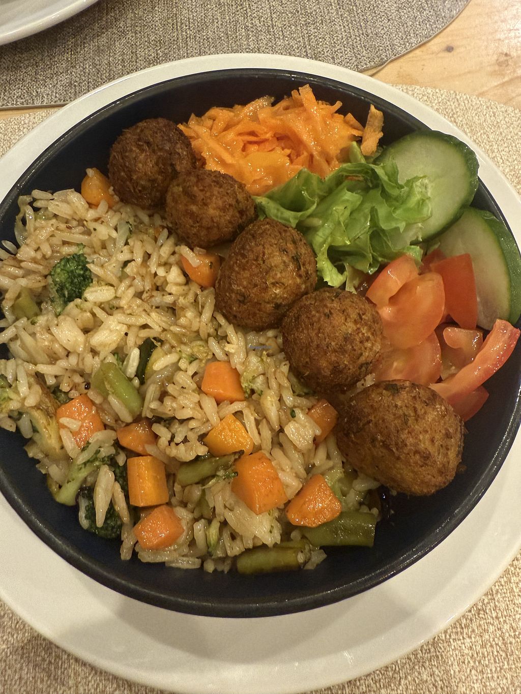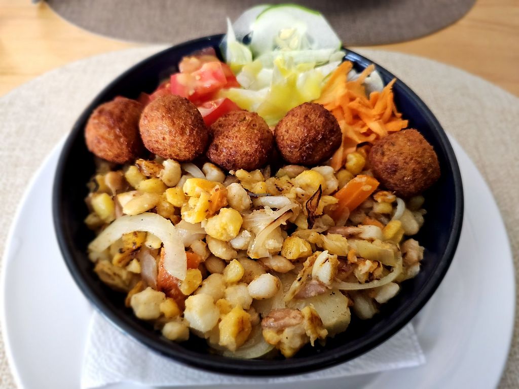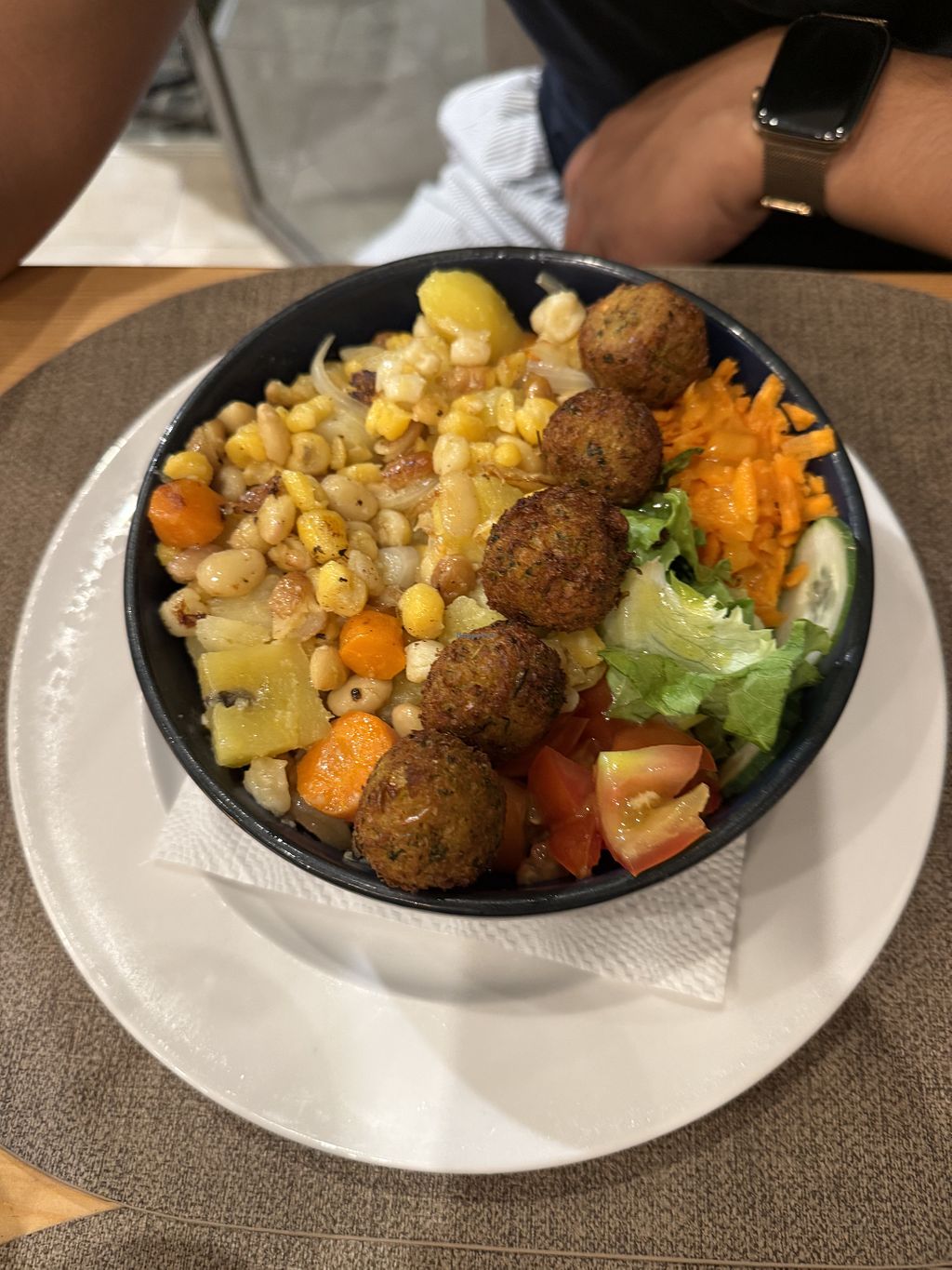 Asian rice with falafel, cachupa with vegan protein, cachucha with fal…