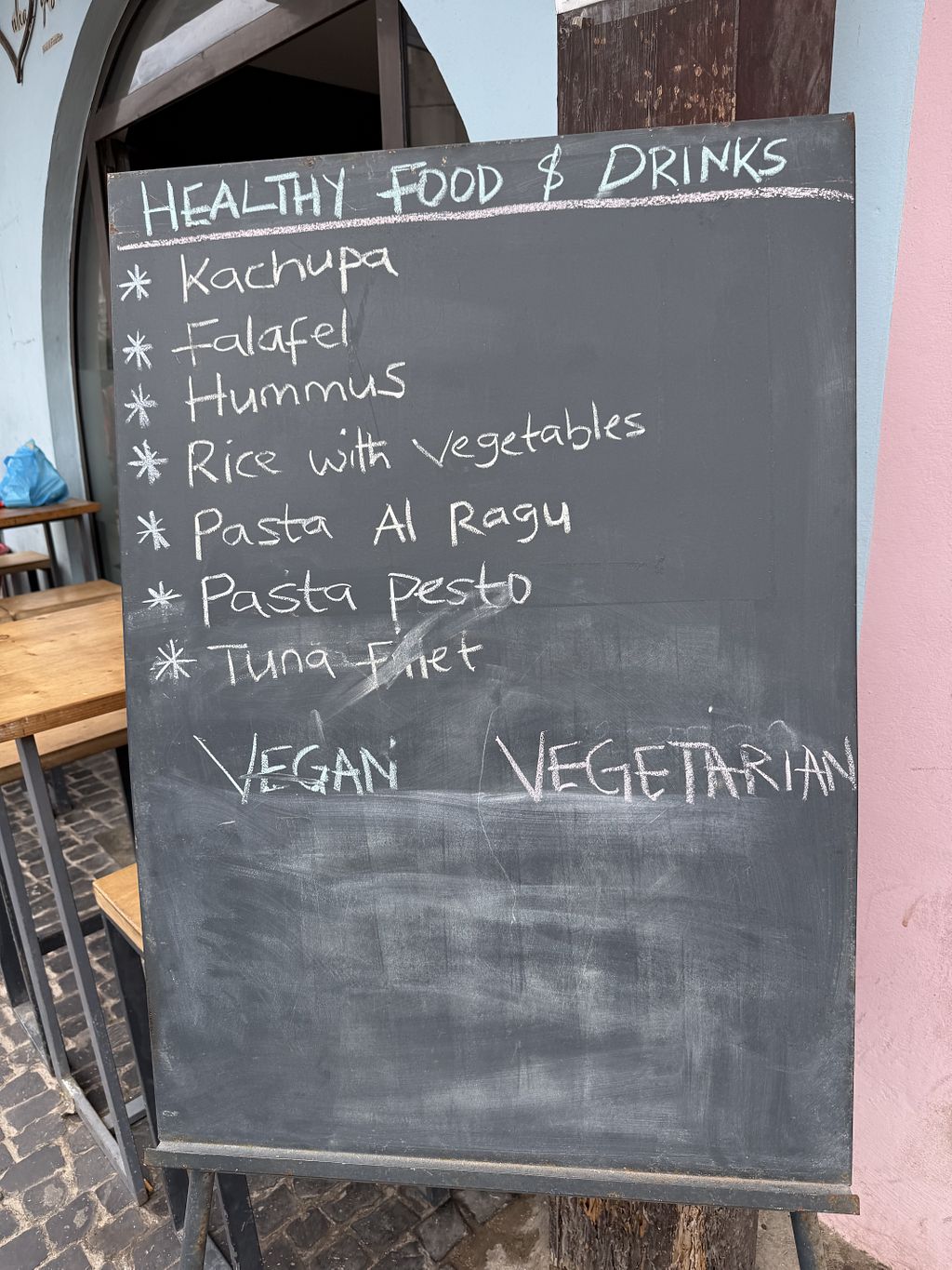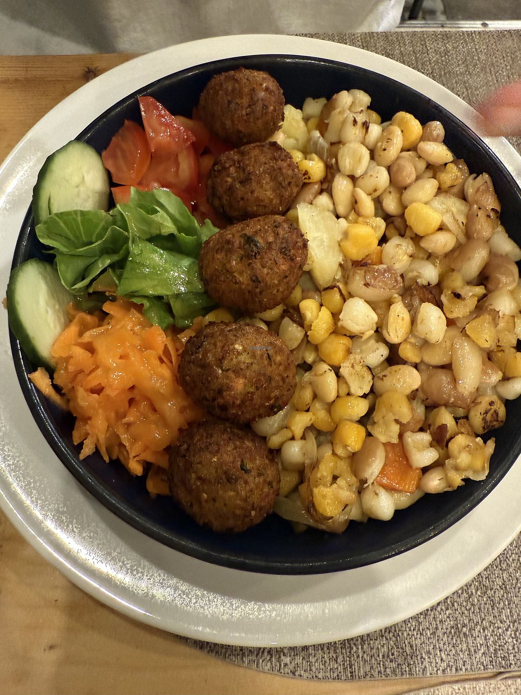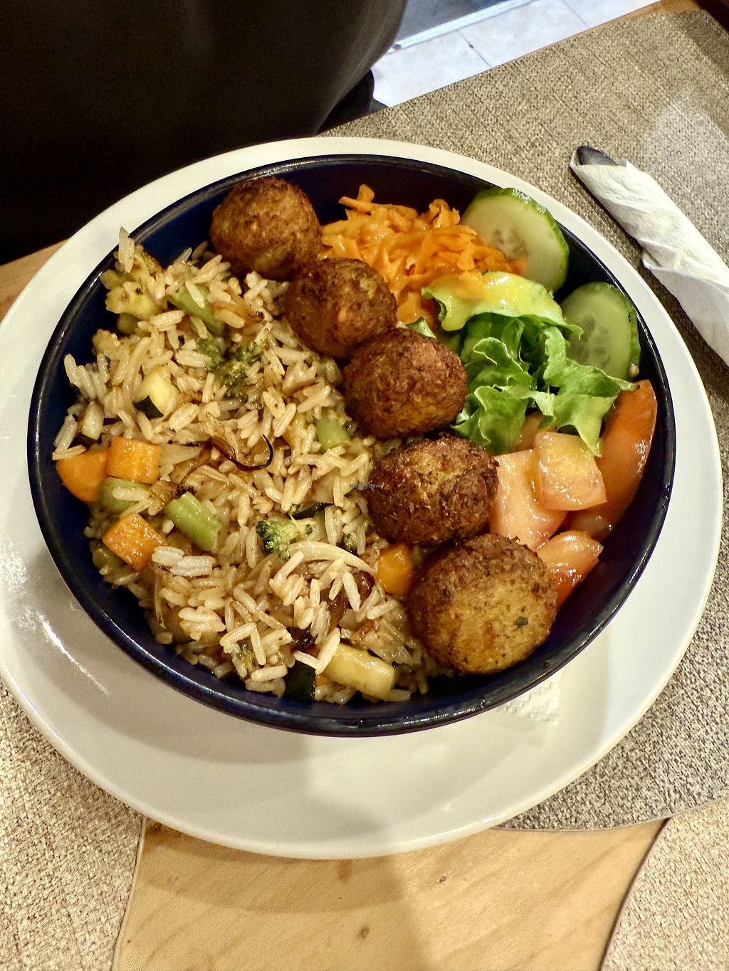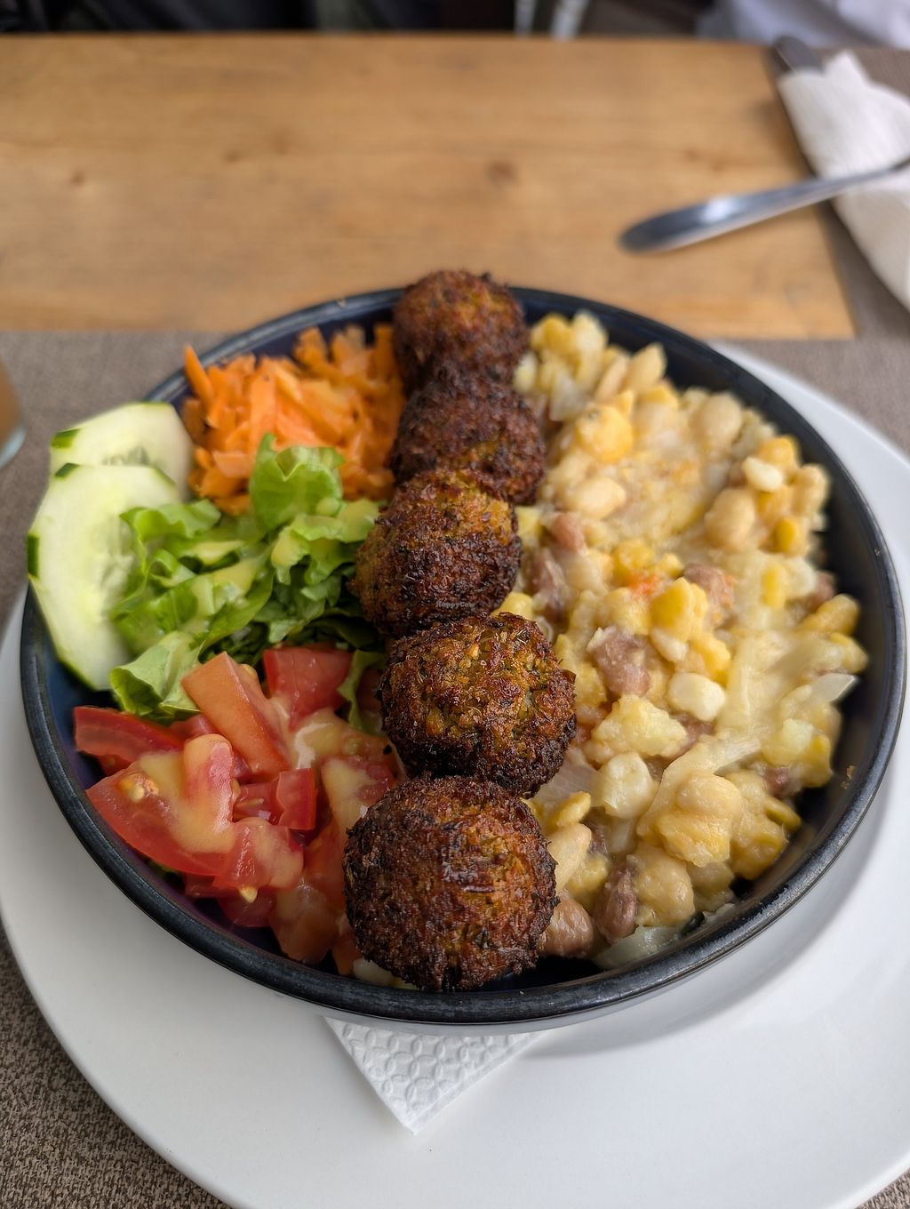 Asian rice with falafel, cachupa with vegan protein, cachucha with fal…