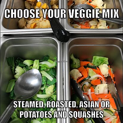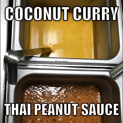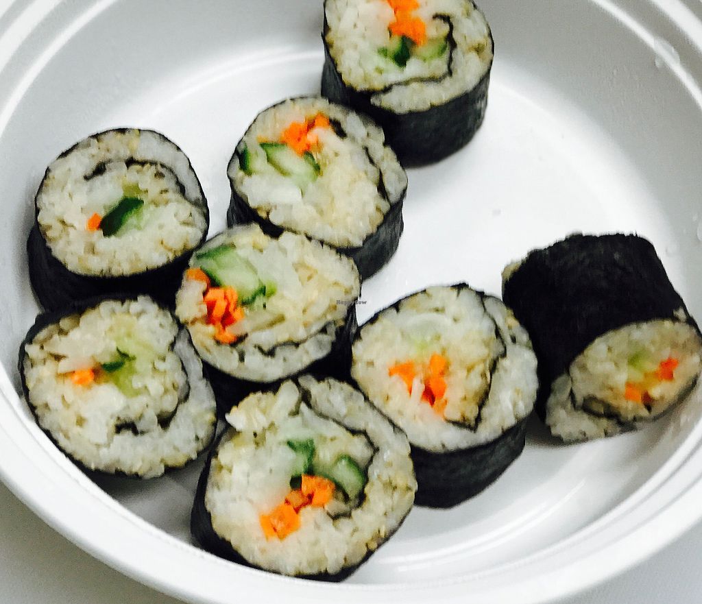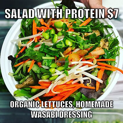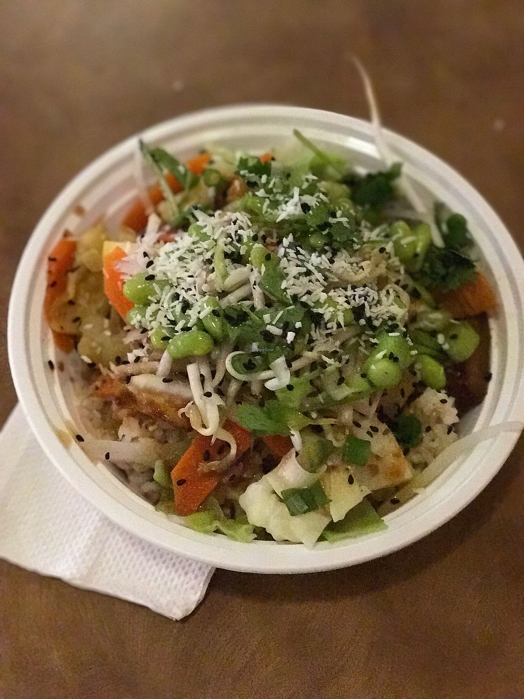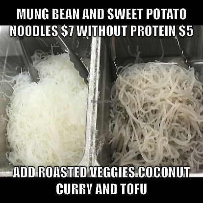 Serves meat, vegan options available. Noodles and salad bar with a variety of dressing choices, including vegan ones like the wasabi and the coconut milk ranch. Has also vegan spring rolls, summer rolls, Korean gimbap sushi, big salad with tofu. Reported closed Jan 2020.