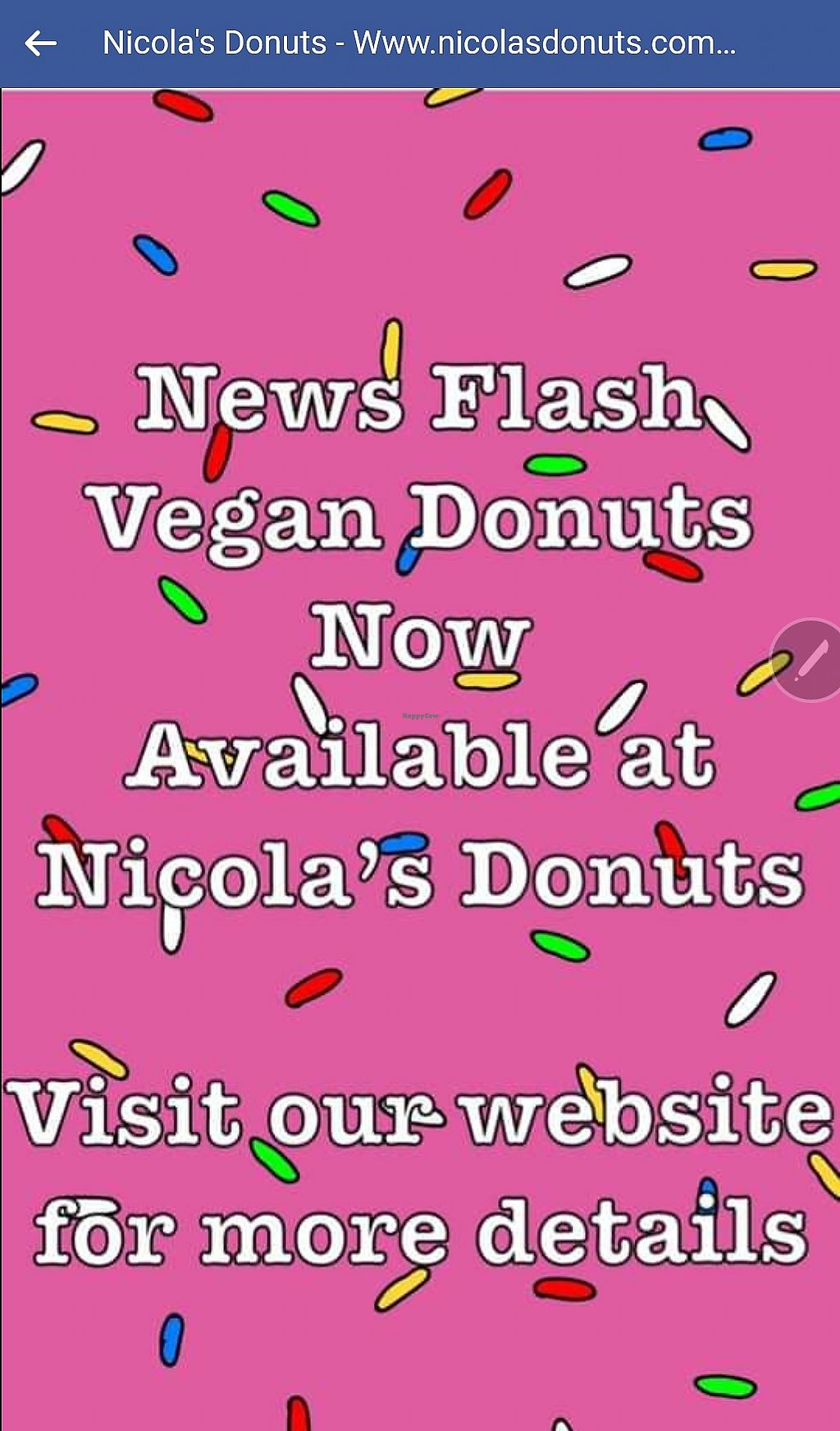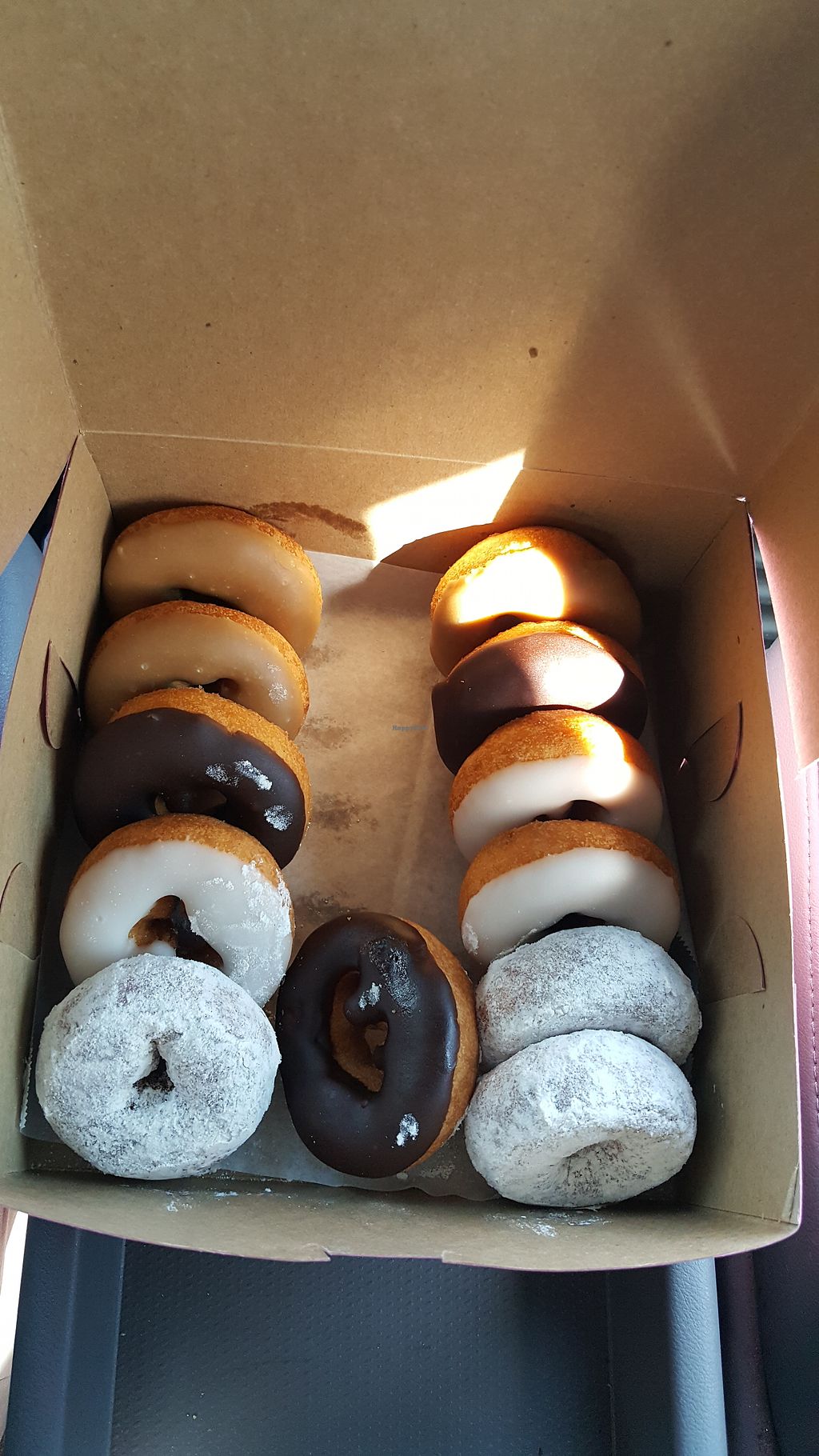 Bakery Offers vegan cake donut options in plain, glazed maple, sugar, chocolate, and powdered sugar coated. Removed Jan 2021 - limited vegan options. More