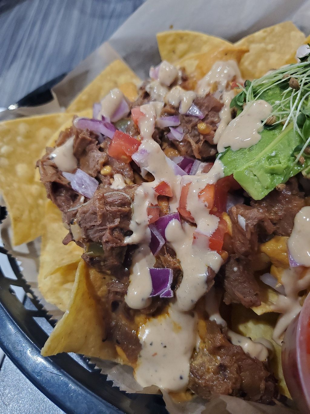 Ordered the Jackfruit Nachos, which were quite tasty BUT the vegan cashew queso is VERY spicy! My daughter had the Impossible Basket, which she really enjoyed!