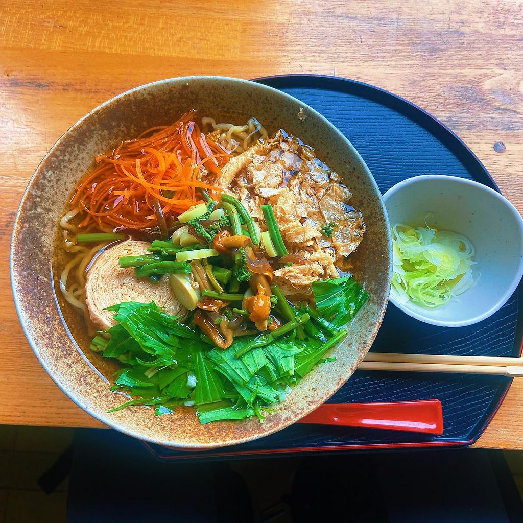 So I was standing in front of the restaurant, contemplating if the 3 vegetarian/vegan menu items were really vegan (one of the ramen had a fishcake in it in the picture). The owner of the place came out and we had a chat. His English was quite good. I asked him specifically: no fish, Dashi or bonito flakes? And apparently the broths are made with a shitake base and he promised to leave out the fishcake.