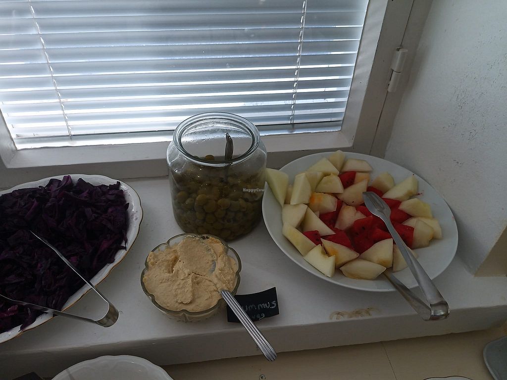 Serves meat, vegan options available. Vintage cafe offering a variety of vegan options including falafel, hummus, vegan ice cream, vegan cake, bread, and salad. Features a lunch buffet with vegan choices. Open Tue 10:00-06:00, Wed-Sat 10:00-18:00, Sun 10:00-16:00. Closed Mon & Sun.