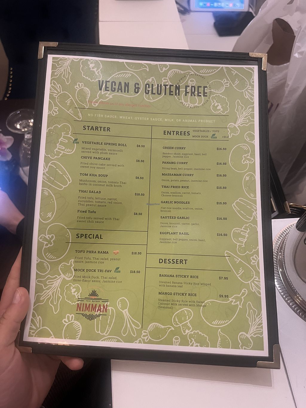 Serves meat, vegan options available. Thai restaurant with vegan menu available upon request. Example offerings include curry, pad thai, chive pancakes and more. Open Mon-Fri 11:30am-3:00pm, Mon-Thu 4:30pm-9:00pm, Fri 4:30pm-9:30pm, Sat 11:00am-9:30pm. Closed Sun.