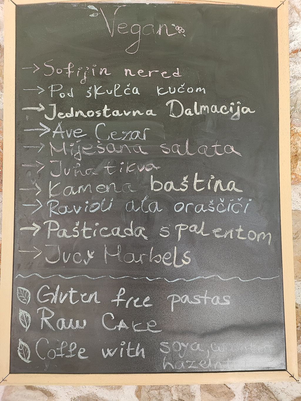 There are a plenty of vegan options such as jucy marbles ,pašticada ,soups ,Sofija's mess ,Ravioli with cashew nuts, simple Dalmatia,Stone heritage, Ave Cezar ,..