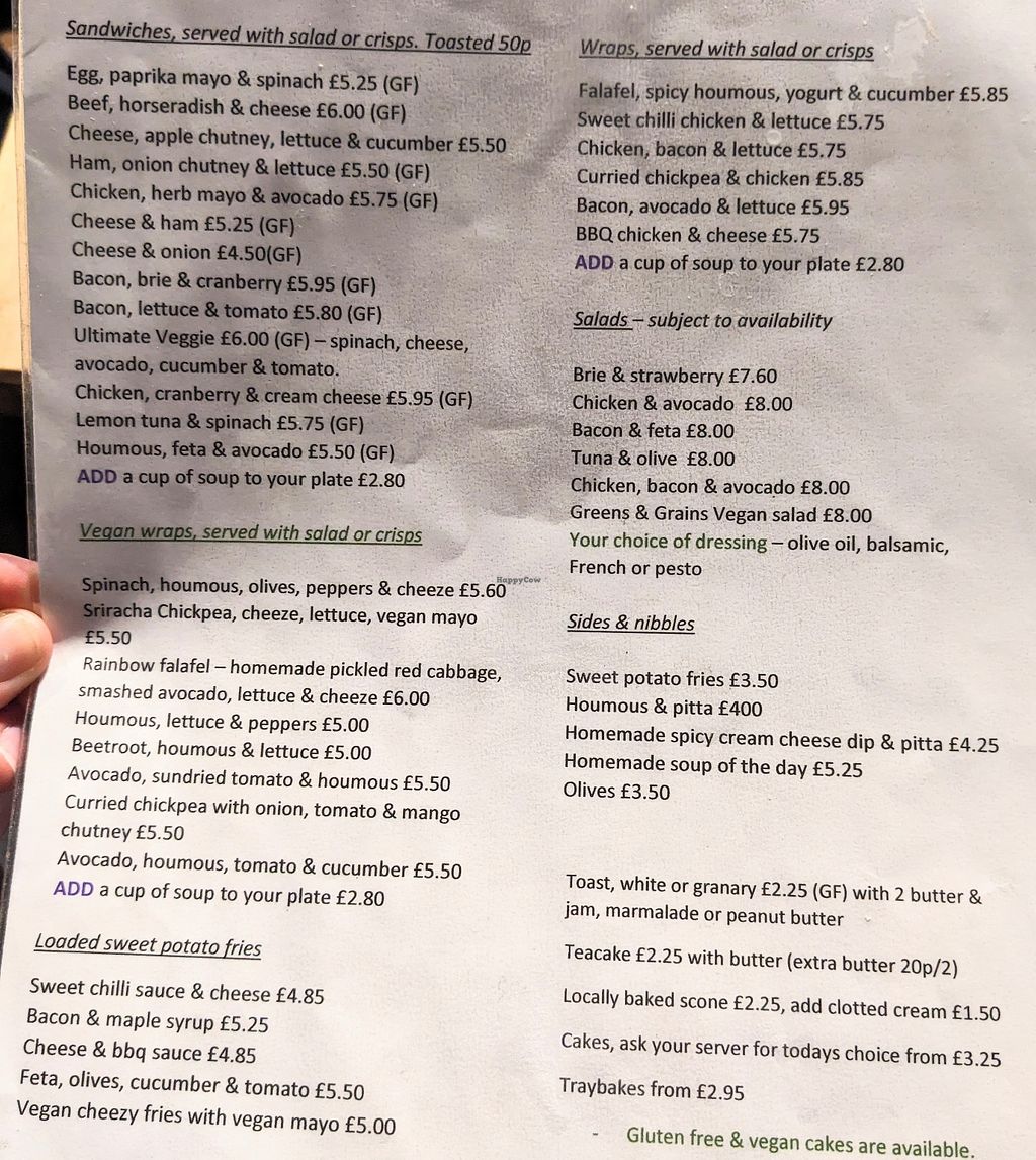 Serves meat, vegan options available. Tea rooms offering vegan cakes, sandwiches, wraps and salads. Non dairy milk available for coffee and tea. Also has some vegan food options on the specials menu such as vegan burritos and a vegan rice bowl. Open Mon-Sat 10:00-17:00. Closed Sun.