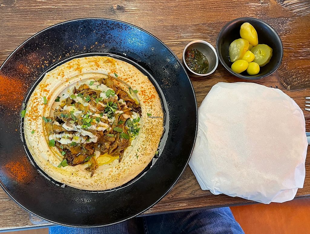 Serves meat, vegan options available. Israeli street food bar/restaurant with vegan options such as Beyond Meat kebab, mushroom schwarma, hummus, falafel, roasted eggplant and more. Reported closed, April 2023.
