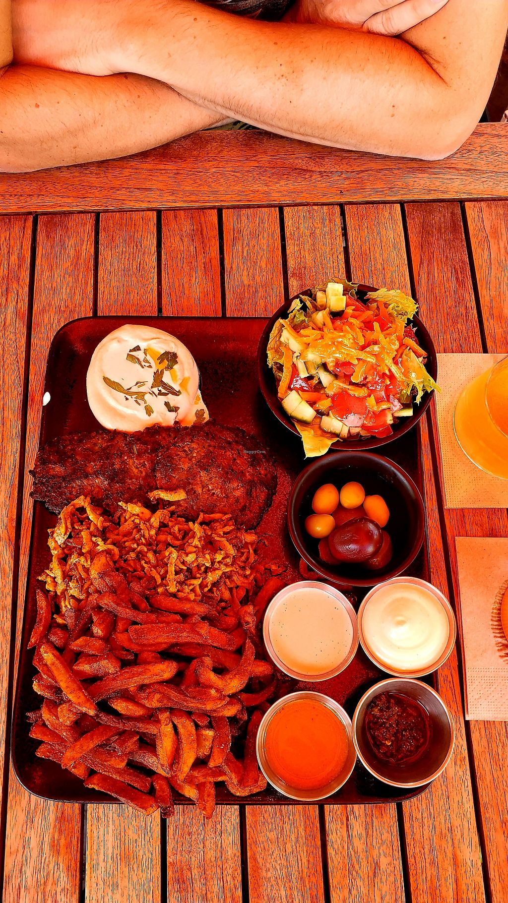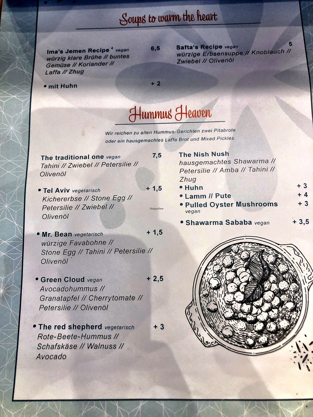 The menu clearly reflects vegetarian and vegan options, and the staff is very well oriented in plant based suggestions. Restaurant is decently located and serves great hummus and vegan sauces variations, beyond meat and pitas. Prices are very good in relation to quality and quantity either.