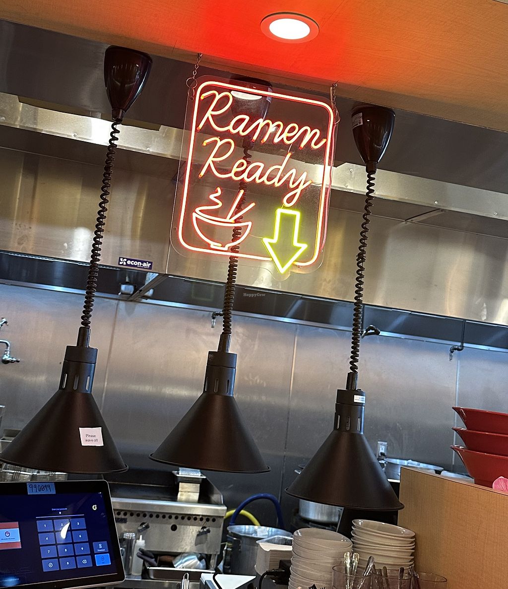 Serves meat, vegan options available. Japanese ramen restaurant offering clearly labeled vegan choices such as curry or spicy ramen with Impossible chicken nuggets and "Vegan Delight" with soybean broth and Impossible chicken nuggets. Open Mon 11:00am-9:30pm, Wed-Sun 11:00am-9:30pm.