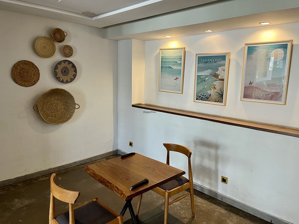 This is a lovely place with a nicely decorated and calming interior. Vegan food is hard to find in Casablanca, so I was happy to find it. As others noted, the remark on the menu that they can adapt dishes to vegetarian or vegan, was optimistic. After much explaining that I didn’t want the feta in my quinoa bowl, it still arrived with feta. I started with a small, free bowl of fried bread chips with a delicious, warm tomato-bell pepper sauce. The quinoa bowl was quickly replaced by one without feta and it was really delicious, containing quinoa, lettuce, grape tomatoes diced zucchini and avocado, with a delicious hummus sauce. It was a good size and did not leave me hungry. The hibiscus drink with lemon and ginger was strong and delicious and had a thick layer of froth on top.