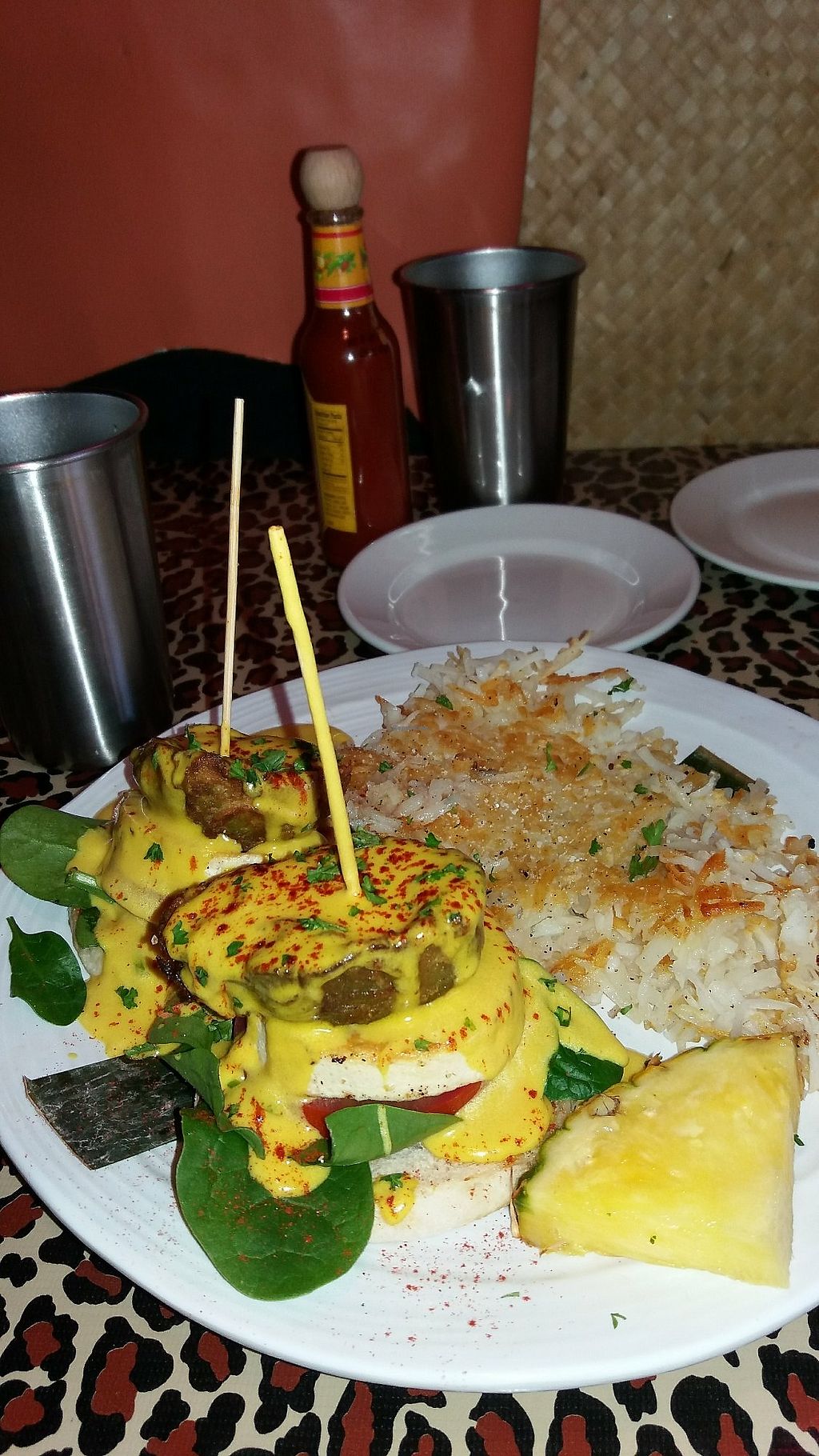 Vegan hollandaise on benedict was delicious and portion was big! Fried avocado, tofu "egg", english muffin, tomato, spinach. Non-greasy hash browns. Breakfast burrito looked big & yummy too: tofu scramble, tempeh bacon, etc inside, cashew queso, smothering sauce, cilantro outside. Super happy with first visit and will return soon...
