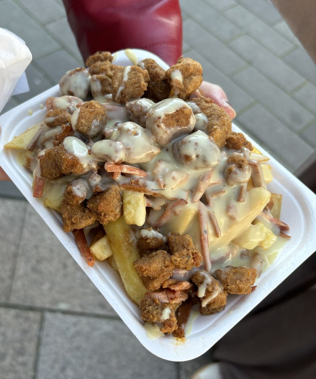 Visited No Frickin Chicken at Taunton Vegan Market today, absolutely delicious food and friendly owner. The loaded fries were fantastic with generous toppings, we also got a three piece box and the coating was crispy and flavoursome, and the texture of the pieces was great too.