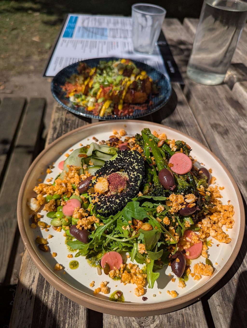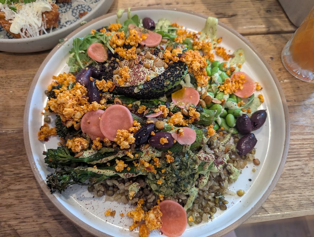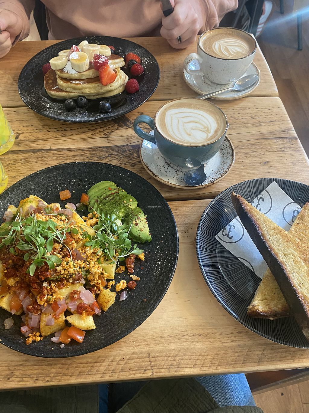 Vegan chorizo hash. Oat latte. Pancakes not vegan but there is a vegan…