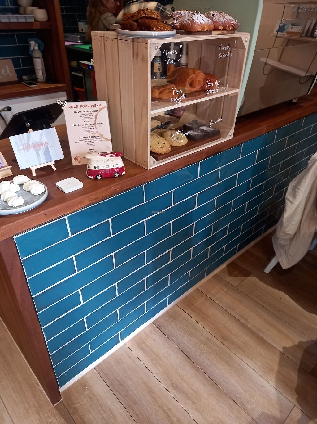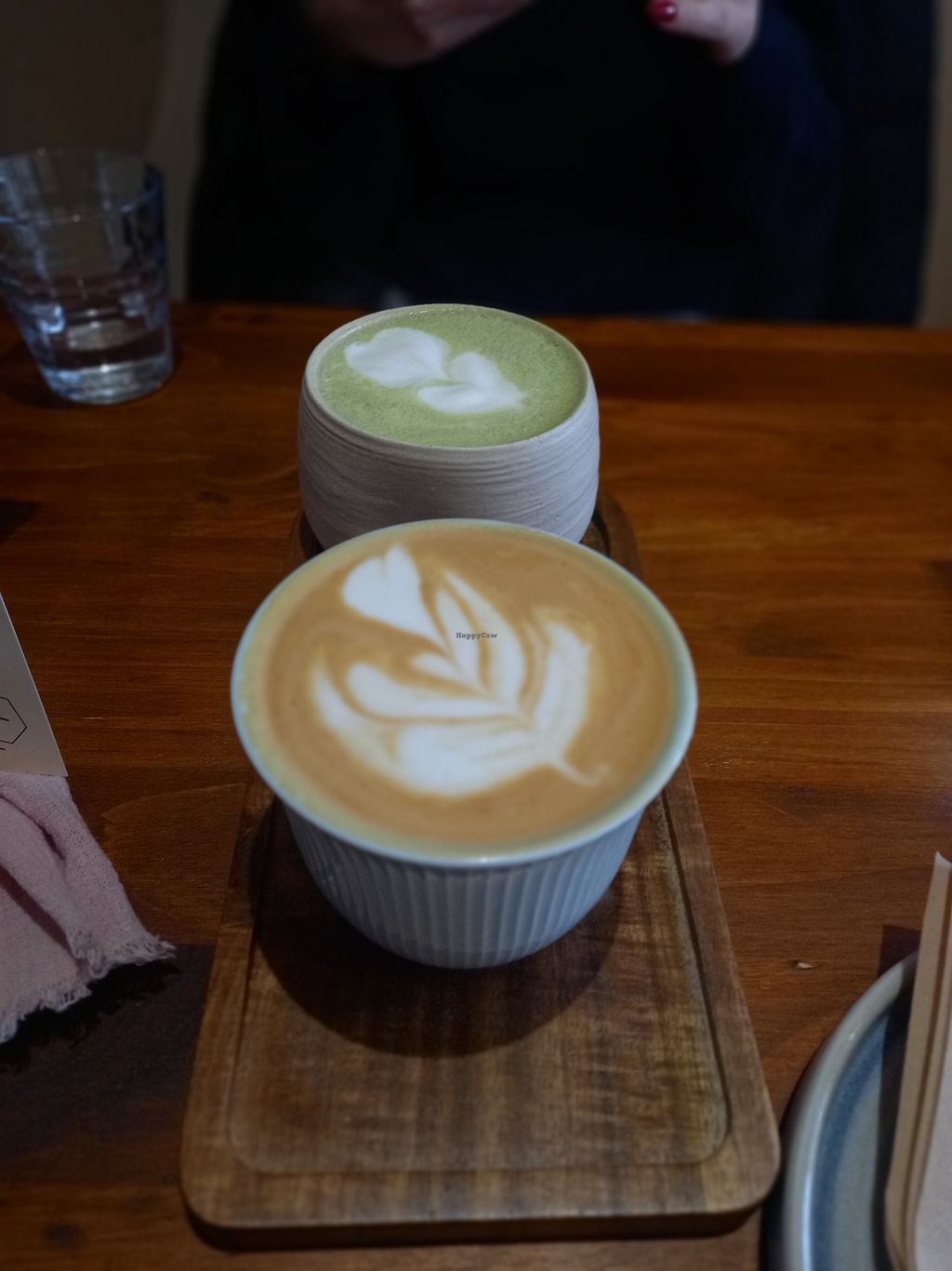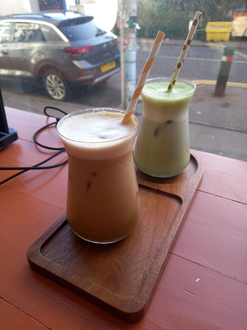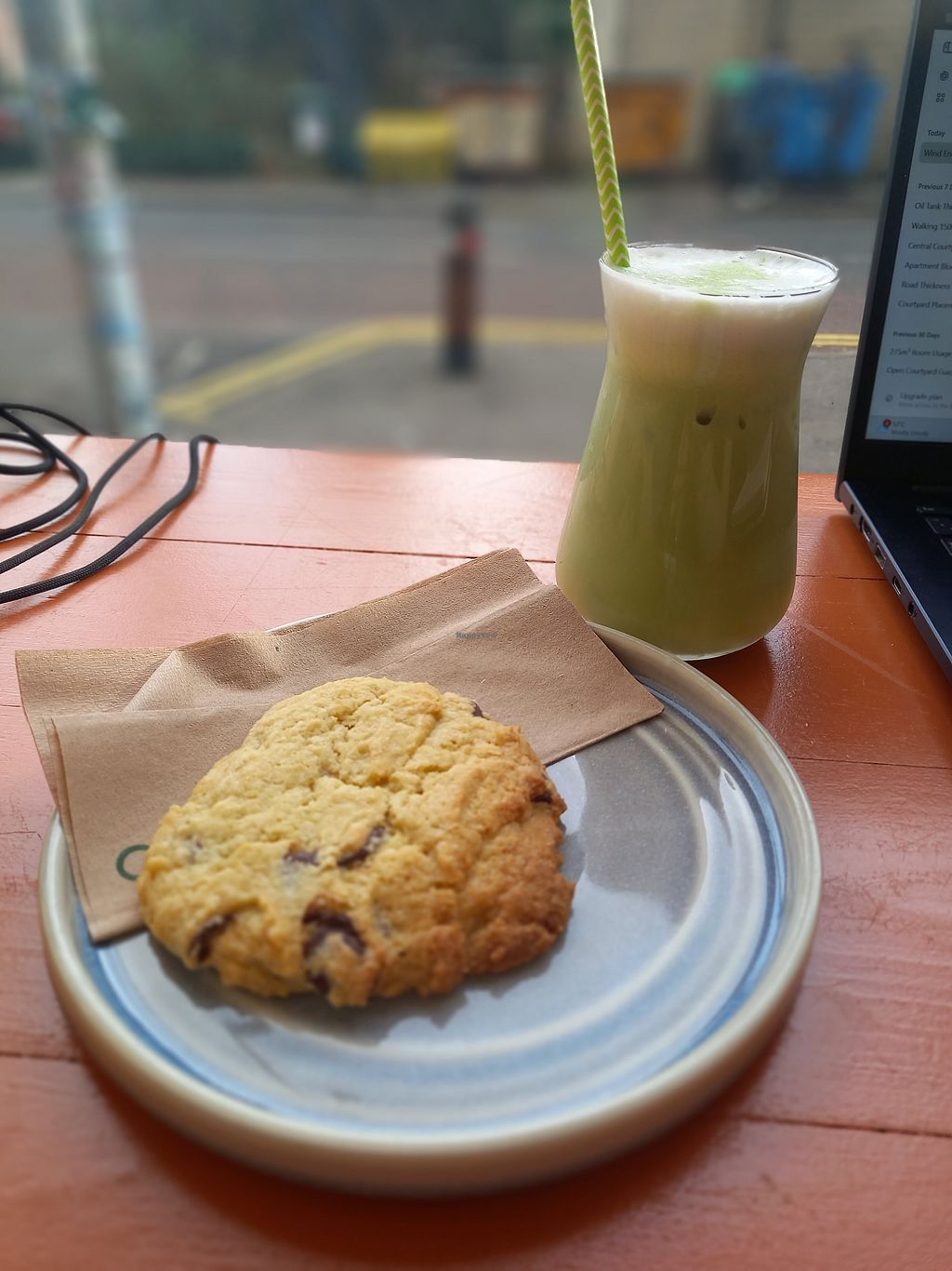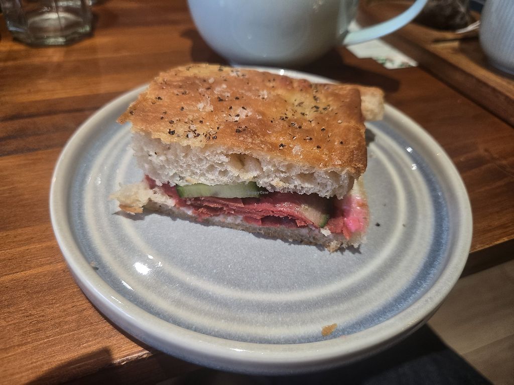Coconut matcha latte and vegan pastrami foccacia toastie