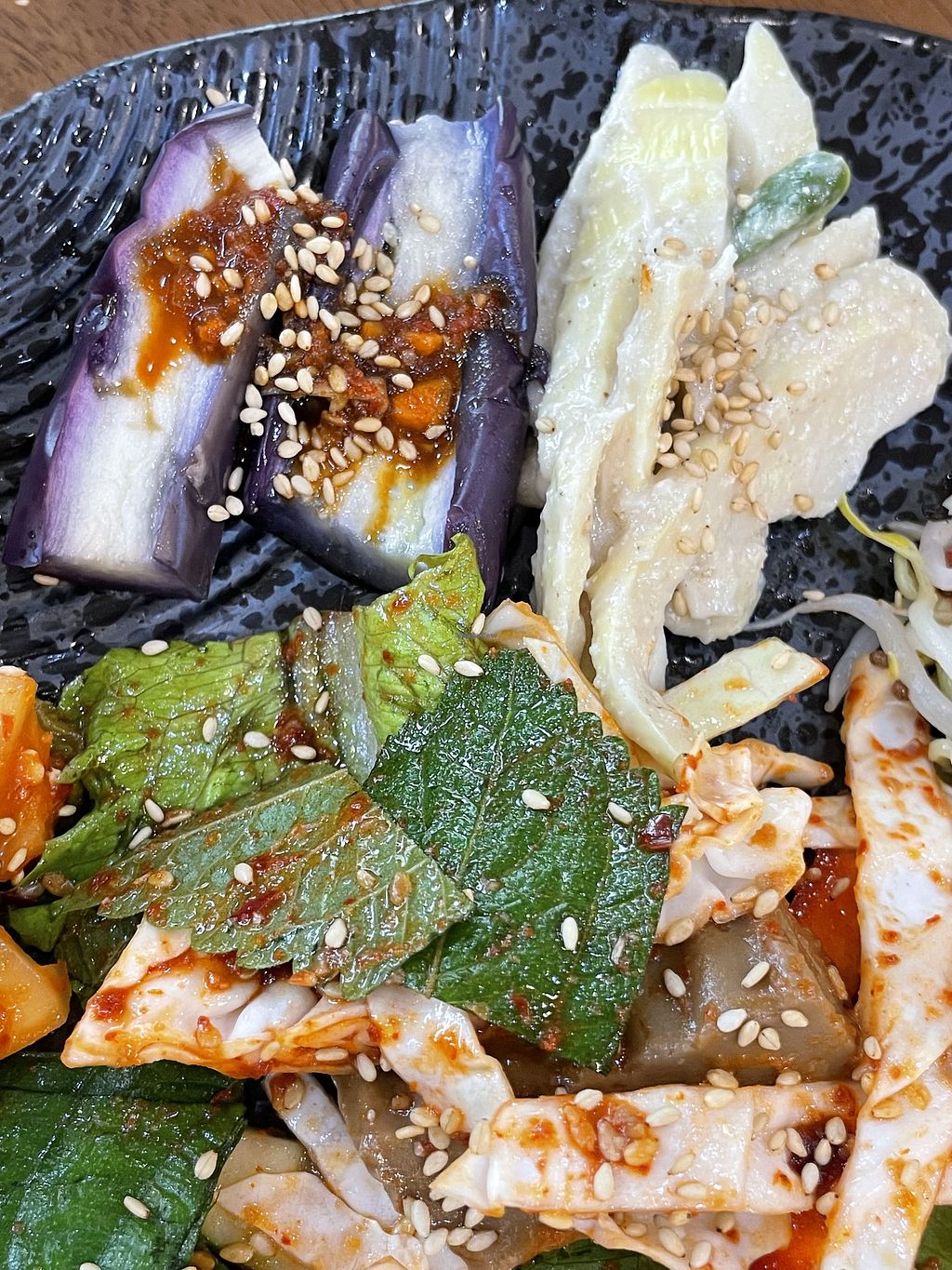 This place is actually completely vegan. There is only one thing on the menu which is lotus leaf wrapped rice and soup with banchan. Food is delicious and healthy.