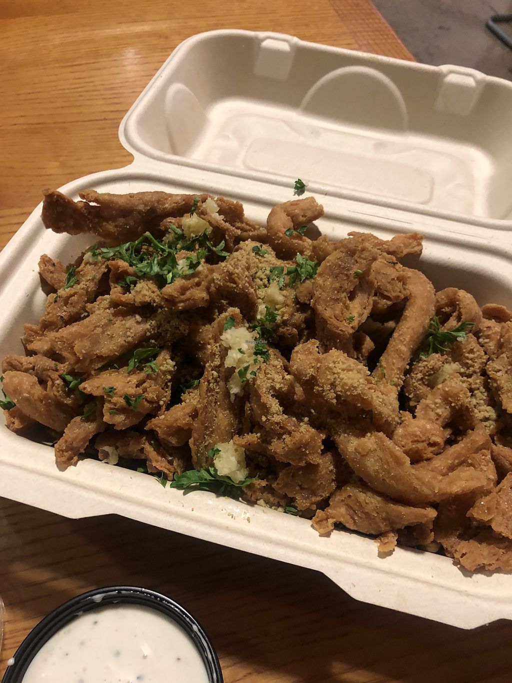 Pros: FRIED SOY CURLS with garlic “parm”!