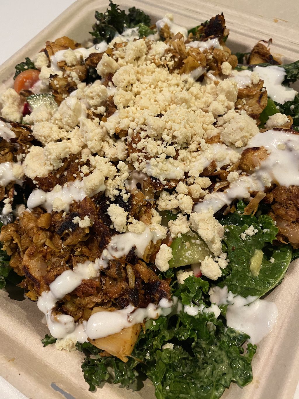 There were so many options I had a hard time choosing. I settled on the nom bowl but swapped the soy curls for seitan. I also got the little side salad and it was very tasty. Someone else mentioned the nachos were good and will try to get those before I leave!