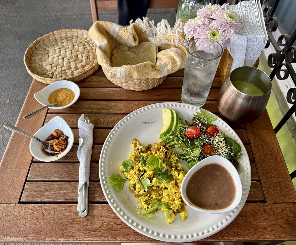 Read moreDesayuné el tofu revuelto a la mexicana (bien sazón) y la quesadilla vegana (me habría gustado que tuvieran queso vegano pero aún así estuvo deliciosa) y un juego detox buenísimo. La persona que me atendió fue muy amable y sonriente.