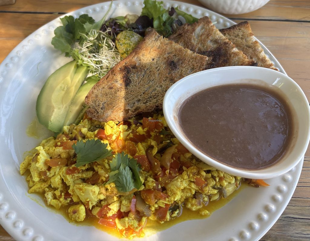 Desayuné un tofu revuelto con verdura que estaba súper bien sazonado. Venía acompañado de frijoles refritos, ensalada y tortillas, todo con muy buen sabor.
