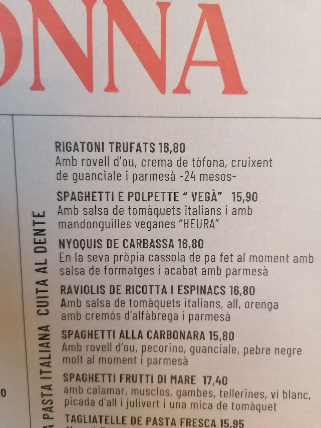 En la carta hay un par de pizzas que con el queso vegano se pueden hacer 100% veganas. También hay una pasta con albóndigas de Heura.