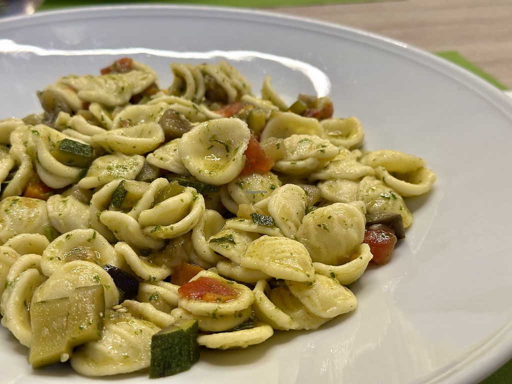 Orecchiette con ragù di verdure e crema di basilico