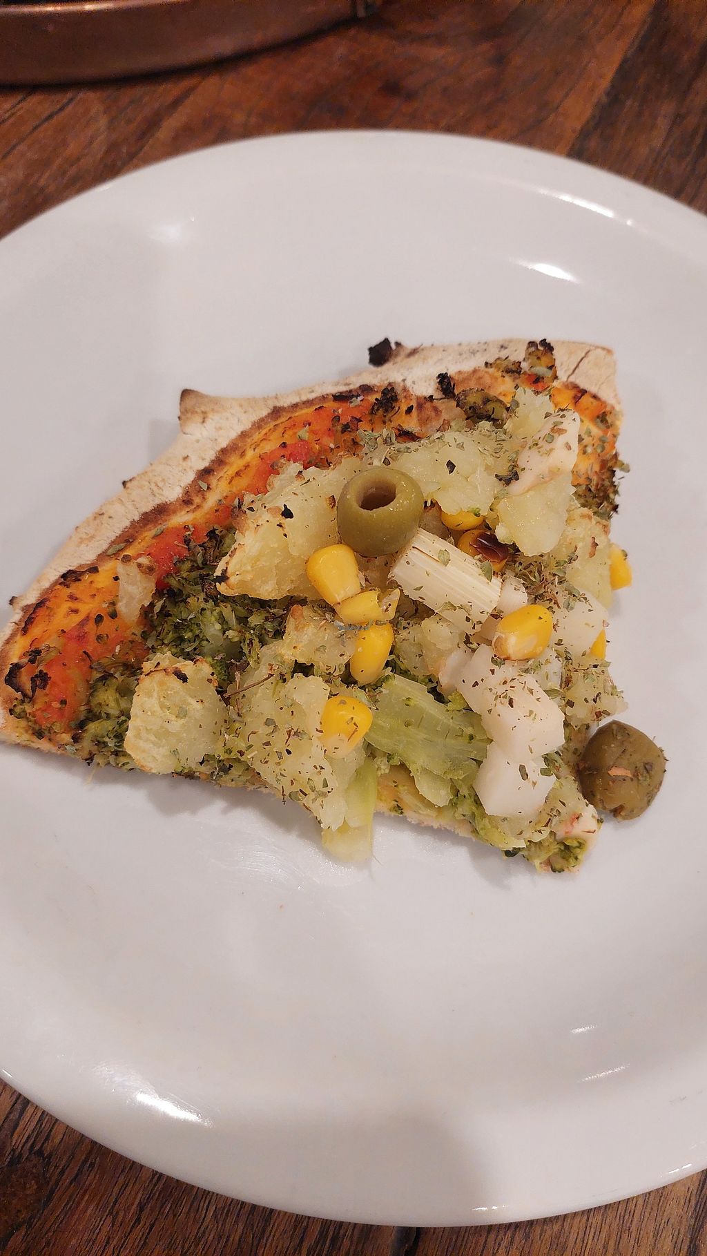 New pizzeria in Campos do Jordão offering one vegan pizza with potato, broccoli, dried tomato, mushroom, heart of palm, and corn. It's a lot and somehow it comes together nicely, even though there is no cheese. The crust is really good. Fair price in comparison to other options around. It's not the best vegan pizza you'll have, but definitely not the worst - it's decent.